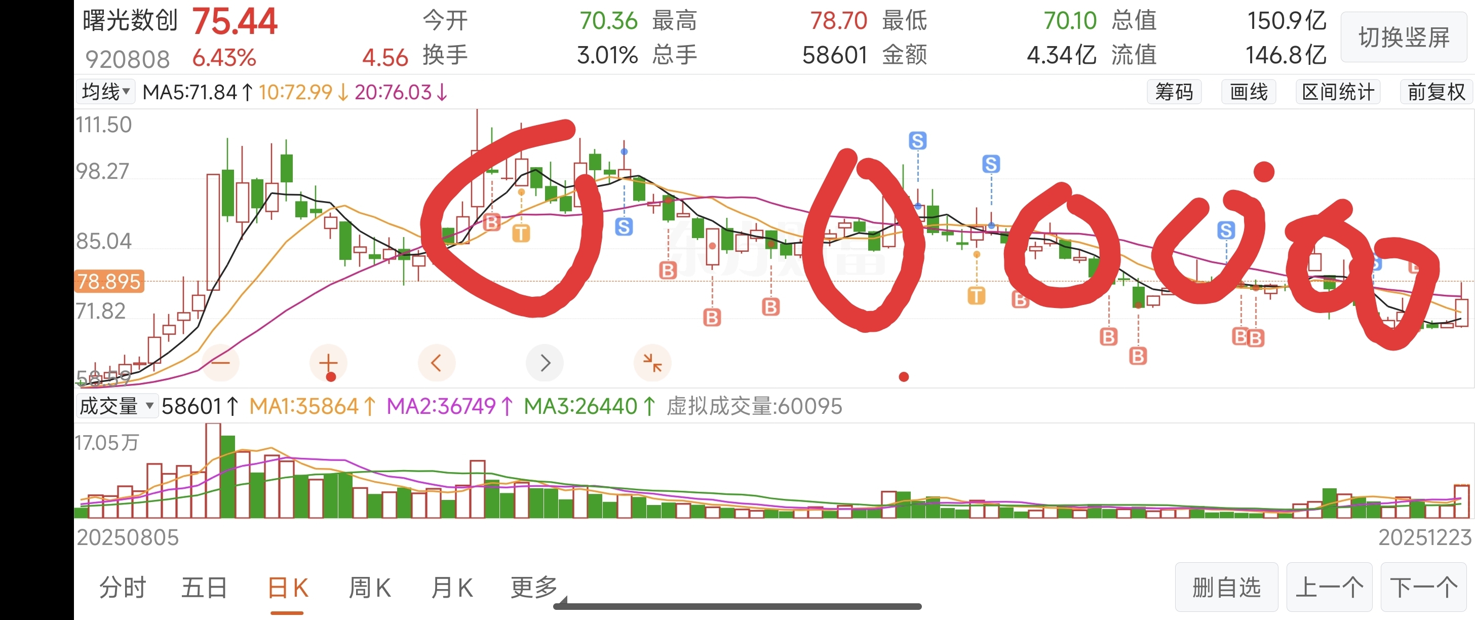 $曙光数创(SZ920808)$ 根据历史K线图,第二天无一例外的下跌了,这次会不会走出不一样的趋势,加油!
