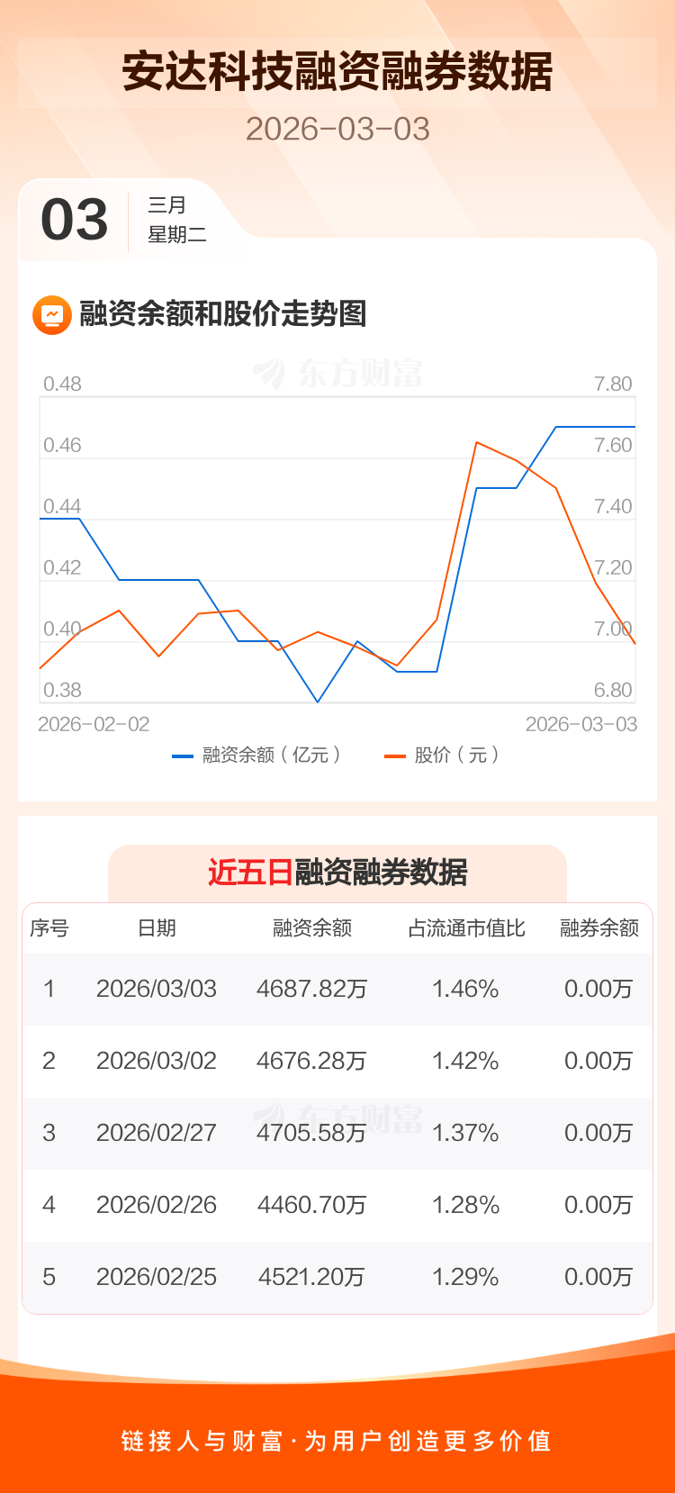 交易所最新数据显示,安达科技于2026年3月3日获融资买入285.69万元,融资偿还274.16万元,当日融资净买入11.54万元。目前,该股融资余额4687.82万,占流通市值比例为1.46%。