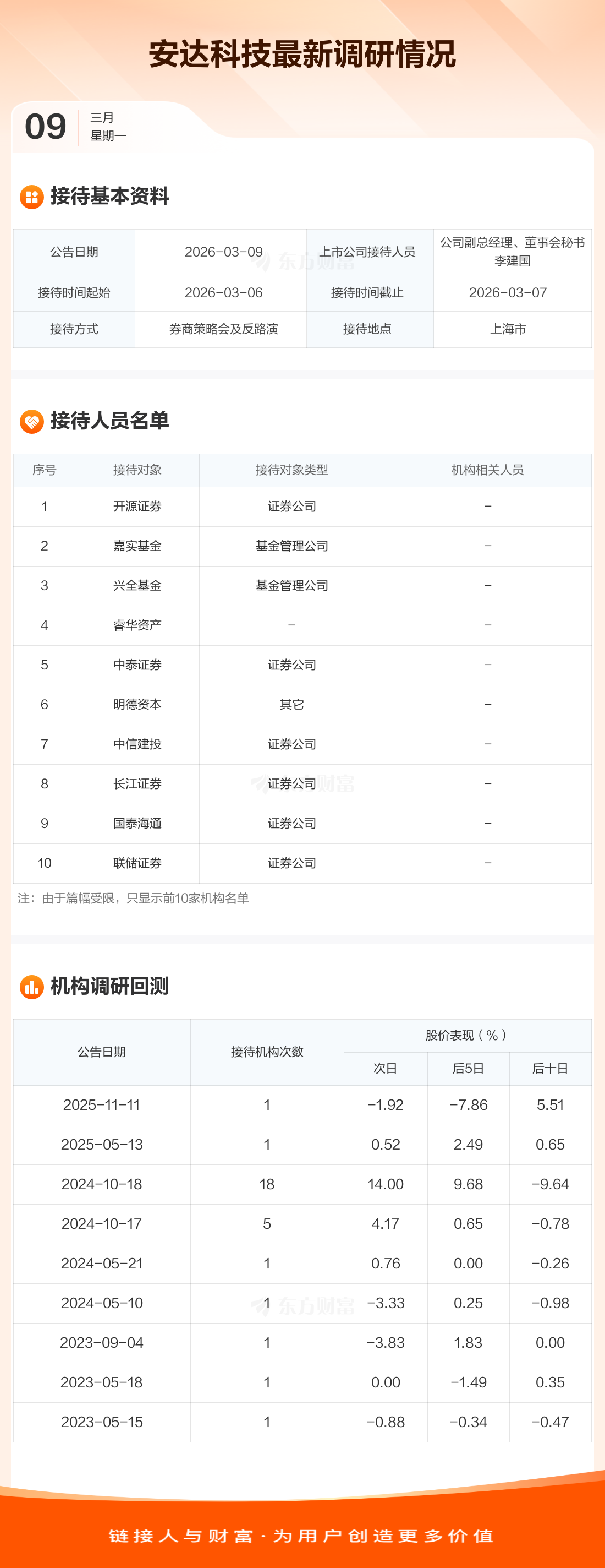 安达科技3月9日公告称,3月6日至3月7日接待开源证券等11家机构调研。接待人员包括公司副总经理、董事会秘书 李建国。