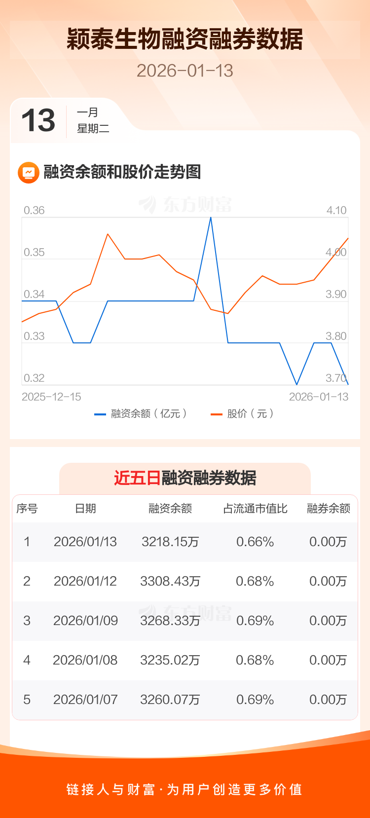 交易所最新数据显示,颖泰生物于2026年1月13日获融资买入295.00万元,融资偿还385.28万元,当日融资净偿还90.28万元。目前,该股融资余额3218.15万,占流通市值比例为0.66%。
