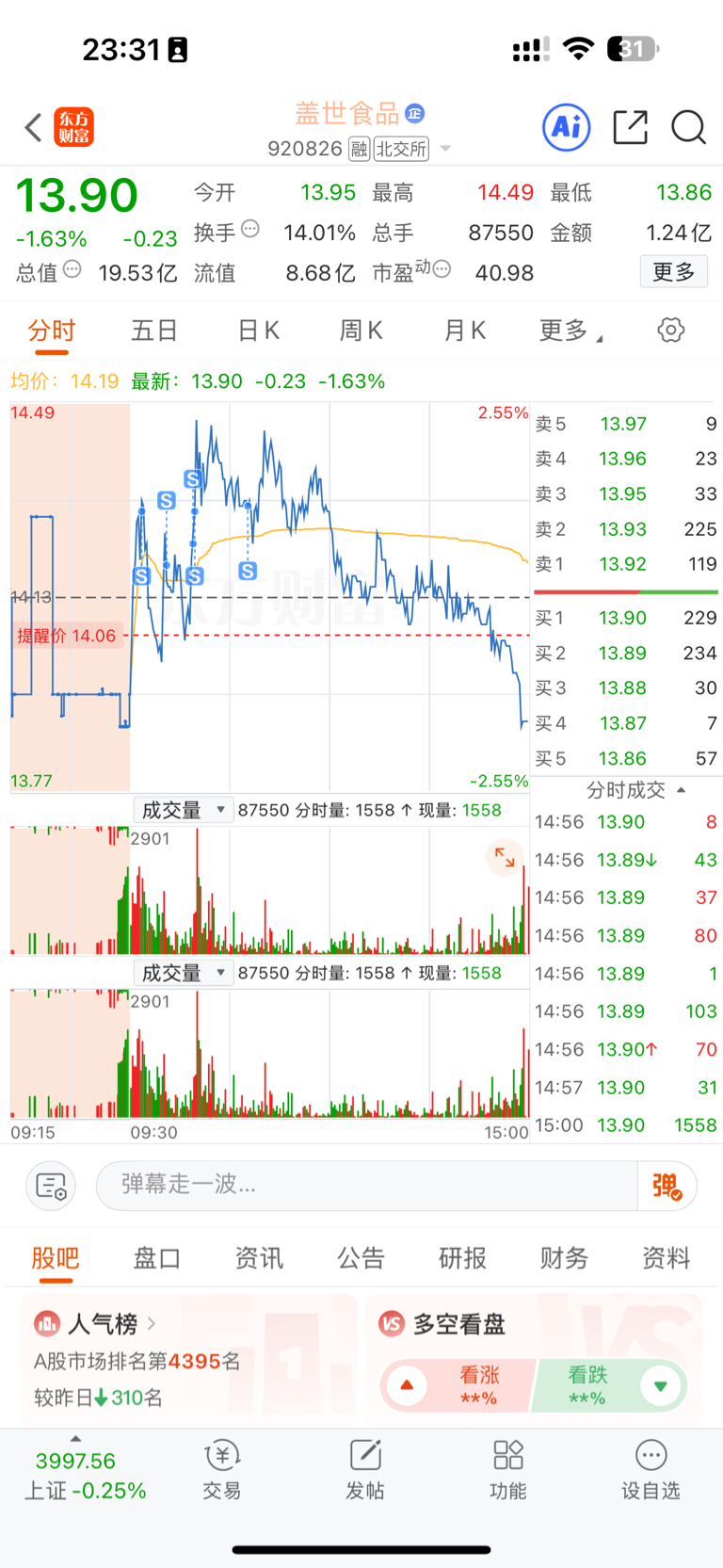$盖世食品(SZ920826)$ 走了 你可以涨了 天天冲高回落拉尾盘 这次尾盘不拉了