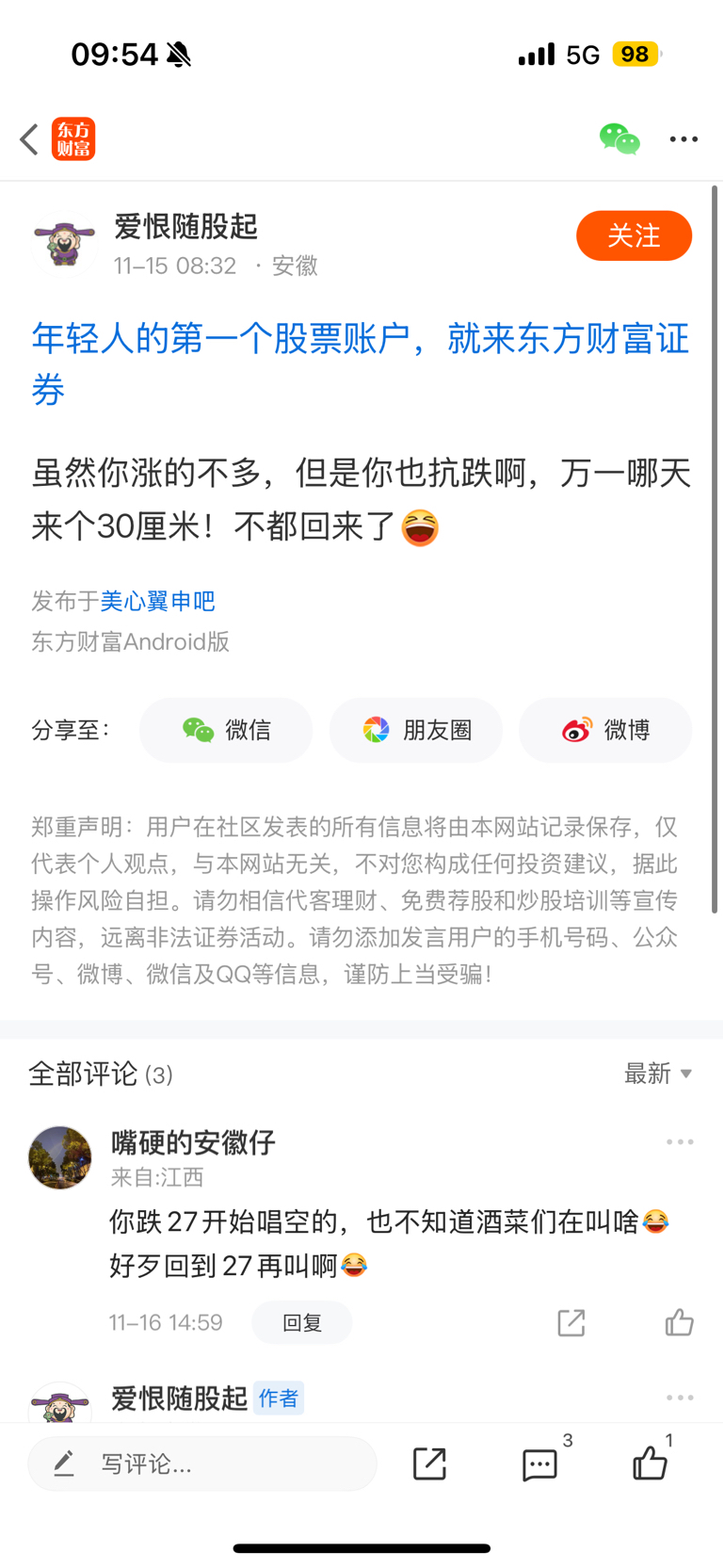 温馨提示: 1.根据《证券法》规定,禁止编造、传播虚假信息或者误导性信息,扰乱证券市场;2.用户在本社区发表的所有资料、言论等仅代表个人观点,与本网站立场无关,不对您构成任何投资建议。用户应基于自己的独立判断,自行决定证券投资并承担相应风险。《东方财富社区管理规定》