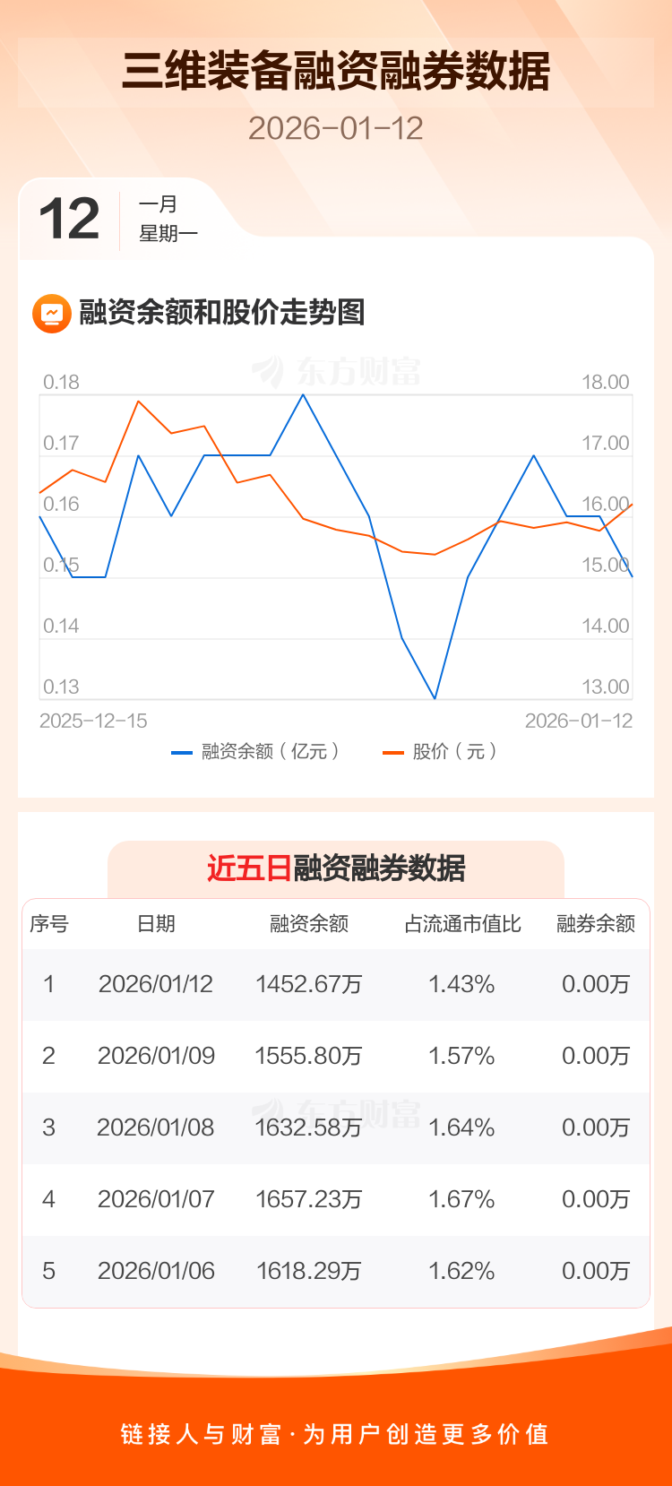 交易所最新数据显示,三维装备于2026年1月12日获融资买入401.91万元,融资偿还505.05万元,当日融资净偿还103.14万元。目前,该股融资余额1452.67万,占流通市值比例为1.43%。
