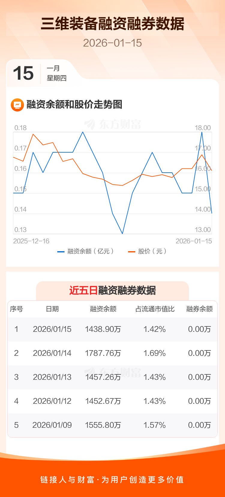 交易所最新数据显示,三维装备于2026年1月15日获融资买入247.65万元,融资偿还596.51万元,当日融资净偿还348.85万元。目前,该股融资余额1438.91万,占流通市值比例为1.42%。