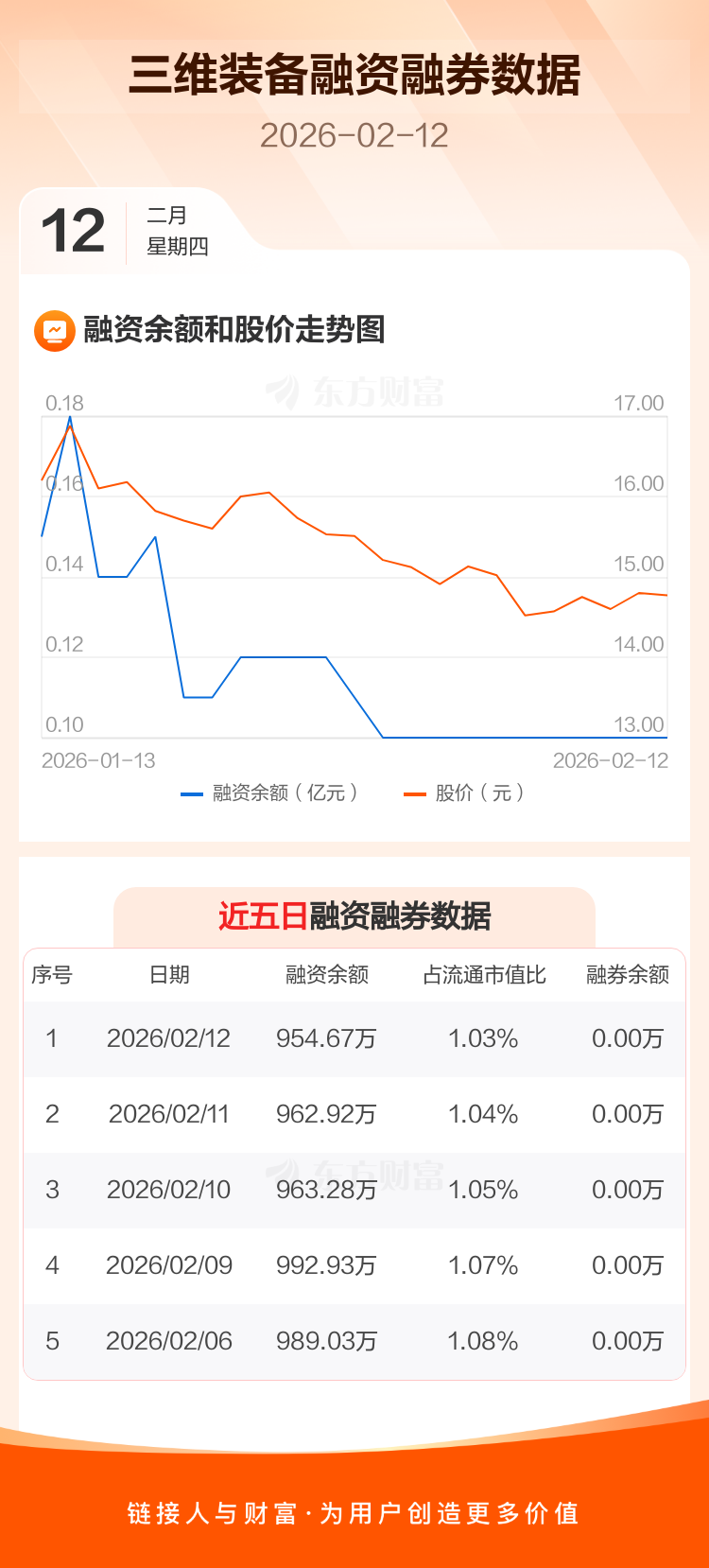 交易所最新数据显示,三维装备于2026年2月12日获融资买入9.27万元,融资偿还17.52万元,当日融资净偿还8.25万元。目前,该股融资余额954.67万,占流通市值比例为1.03%。