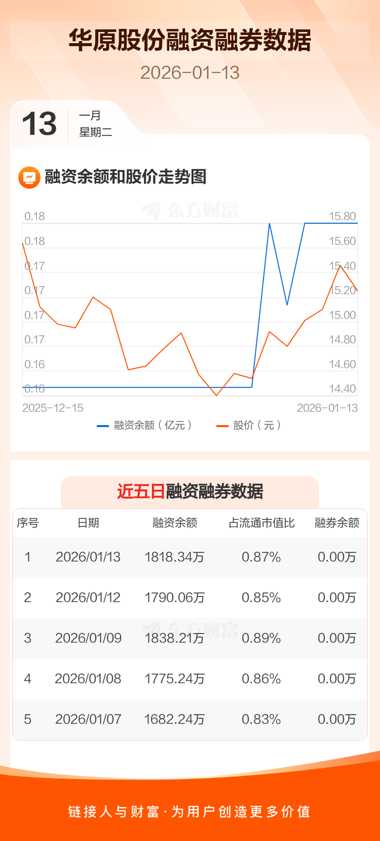 交易所最新数据显示,华原股份于2026年1月13日获融资买入236.94万元,融资偿还208.66万元,当日融资净买入28.28万元。目前,该股融资余额1818.34万,占流通市值比例为0.87%。