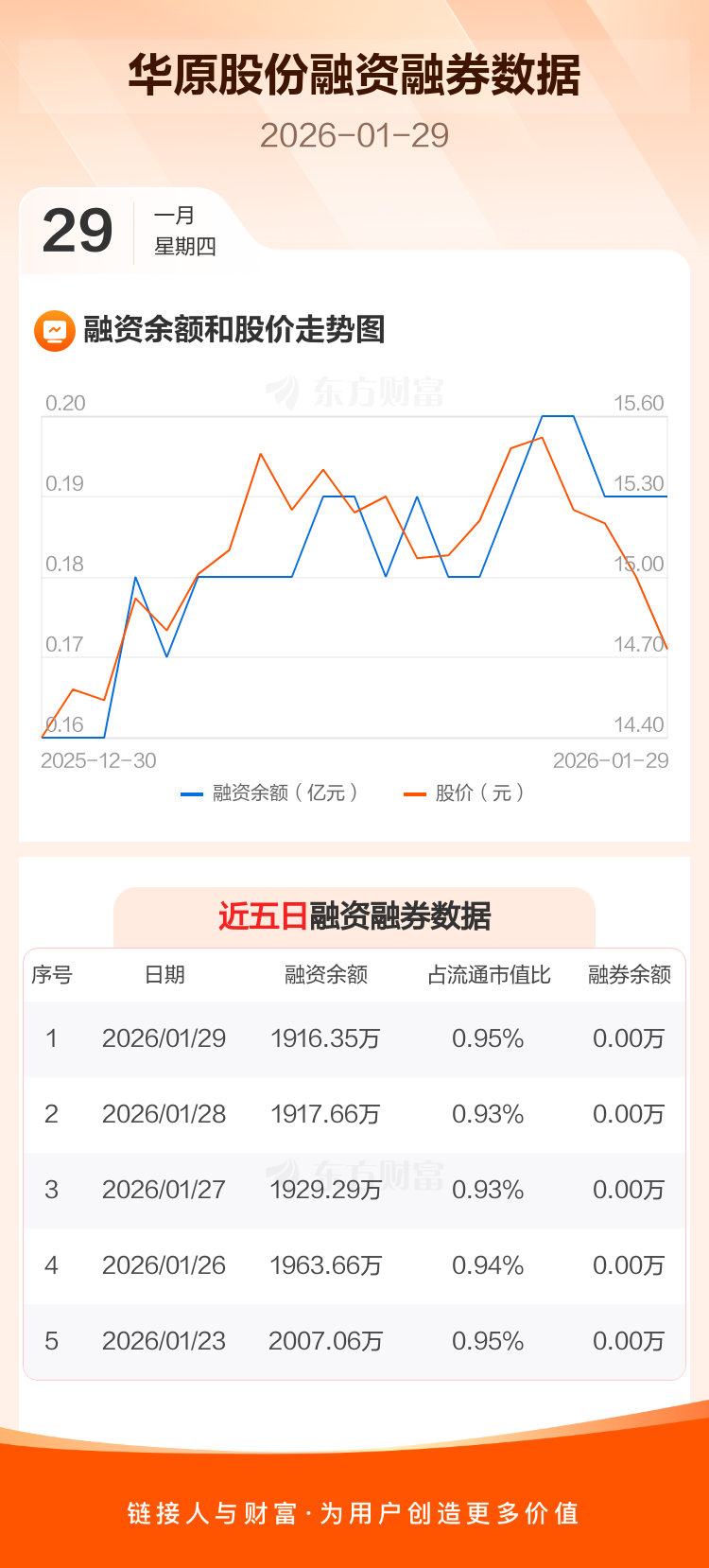 交易所最新数据显示,华原股份于2026年1月29日获融资买入9.44万元,融资偿还10.75万元,当日融资净偿还1.31万元。目前,该股融资余额1916.35万,占流通市值比例为0.95%。