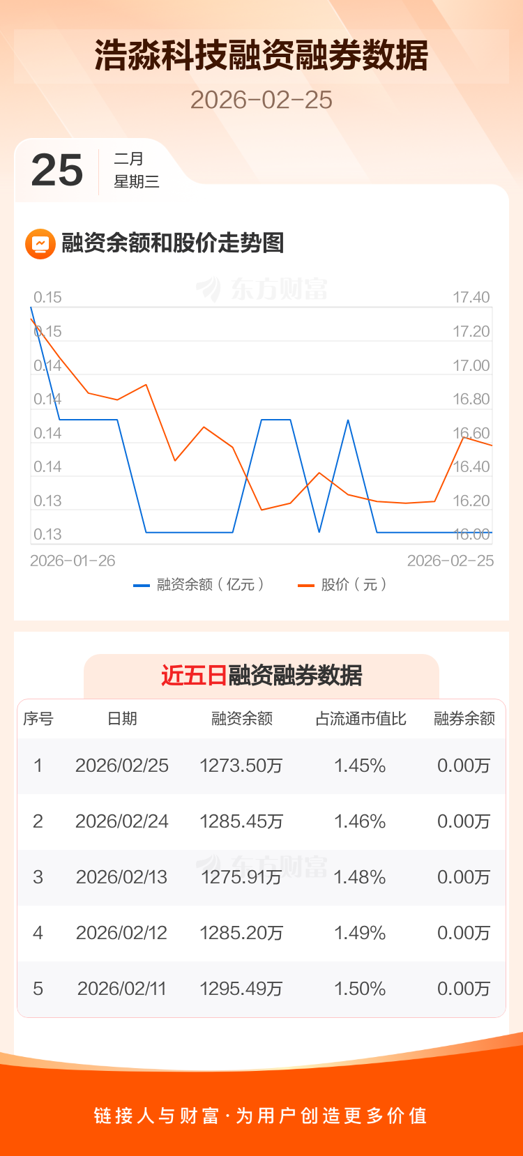 交易所最新数据显示,浩淼科技于2026年2月25日获融资买入36.74万元,融资偿还48.69万元,当日融资净偿还11.95万元。目前,该股融资余额1273.50万,占流通市值比例为1.45%。