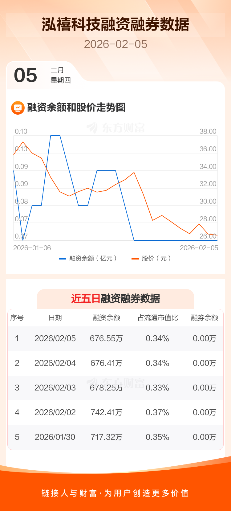 交易所最新数据显示,泓禧科技于2026年2月5日获融资买入43.49万元,融资偿还43.36万元,当日融资净买入1358元。目前,该股融资余额676.55万,占流通市值比例为0.34%。