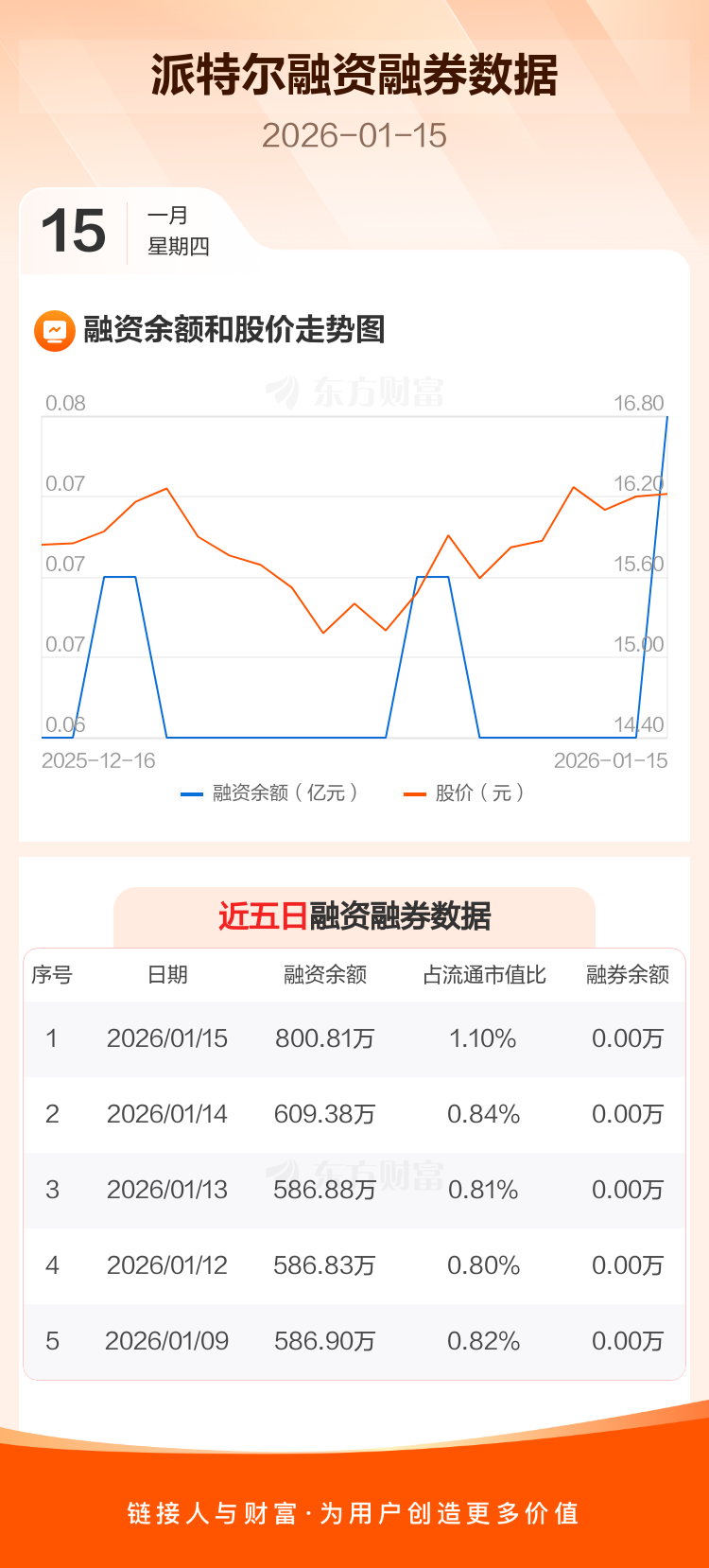 交易所最新数据显示,派特尔于2026年1月15日获融资买入288.00万元,融资偿还96.58万元,当日融资净买入191.42万元。目前,该股融资余额800.81万,占流通市值比例为1.10%。