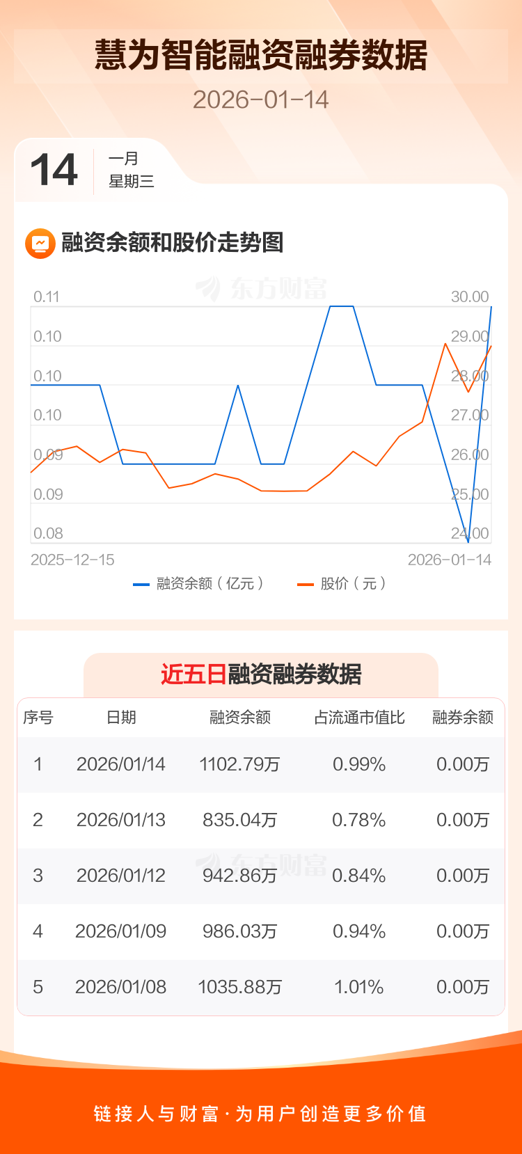 交易所最新数据显示,慧为智能于2026年1月14日获融资买入443.73万元,融资偿还175.98万元,当日融资净买入267.75万元。目前,该股融资余额1102.79万,占流通市值比例为0.99%。