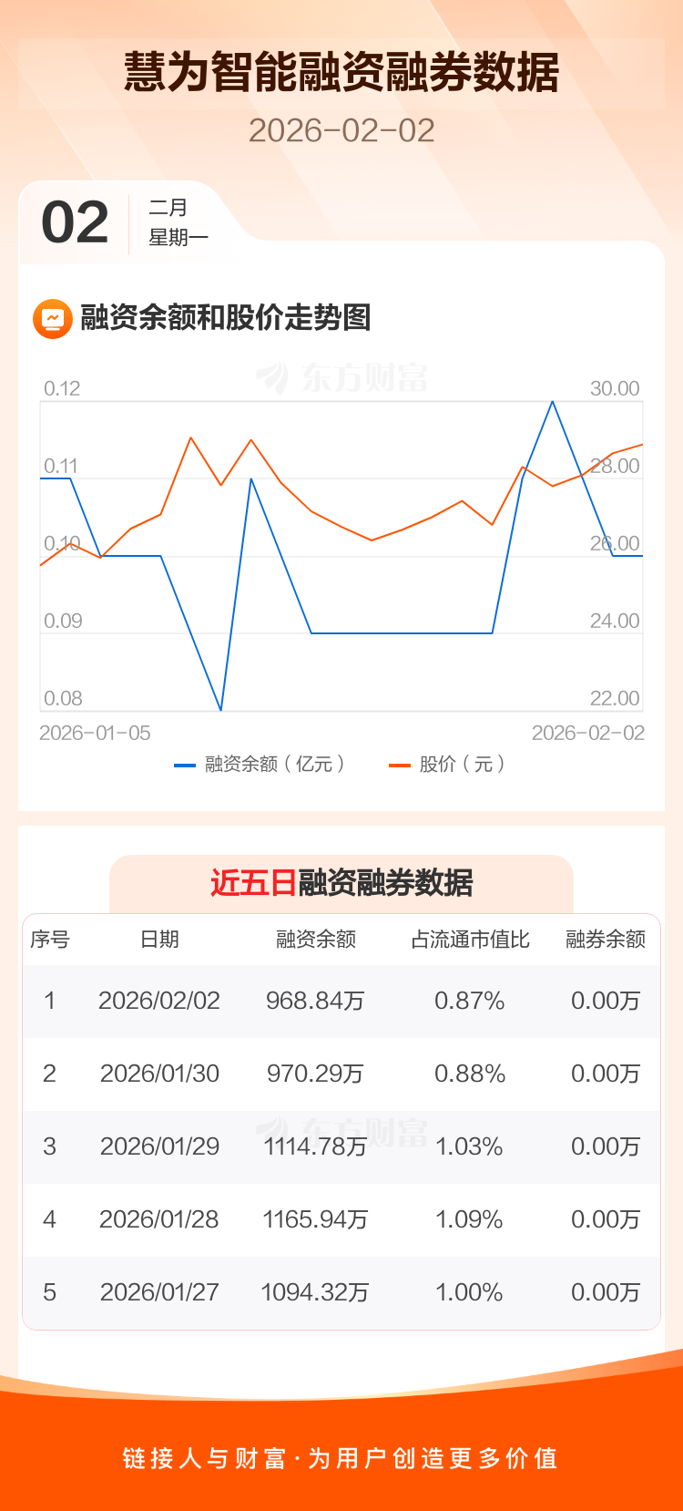 交易所最新数据显示,慧为智能于2026年2月2日获融资买入169.08万元,融资偿还170.53万元,当日融资净偿还1.45万元。目前,该股融资余额968.84万,占流通市值比例为0.87%。