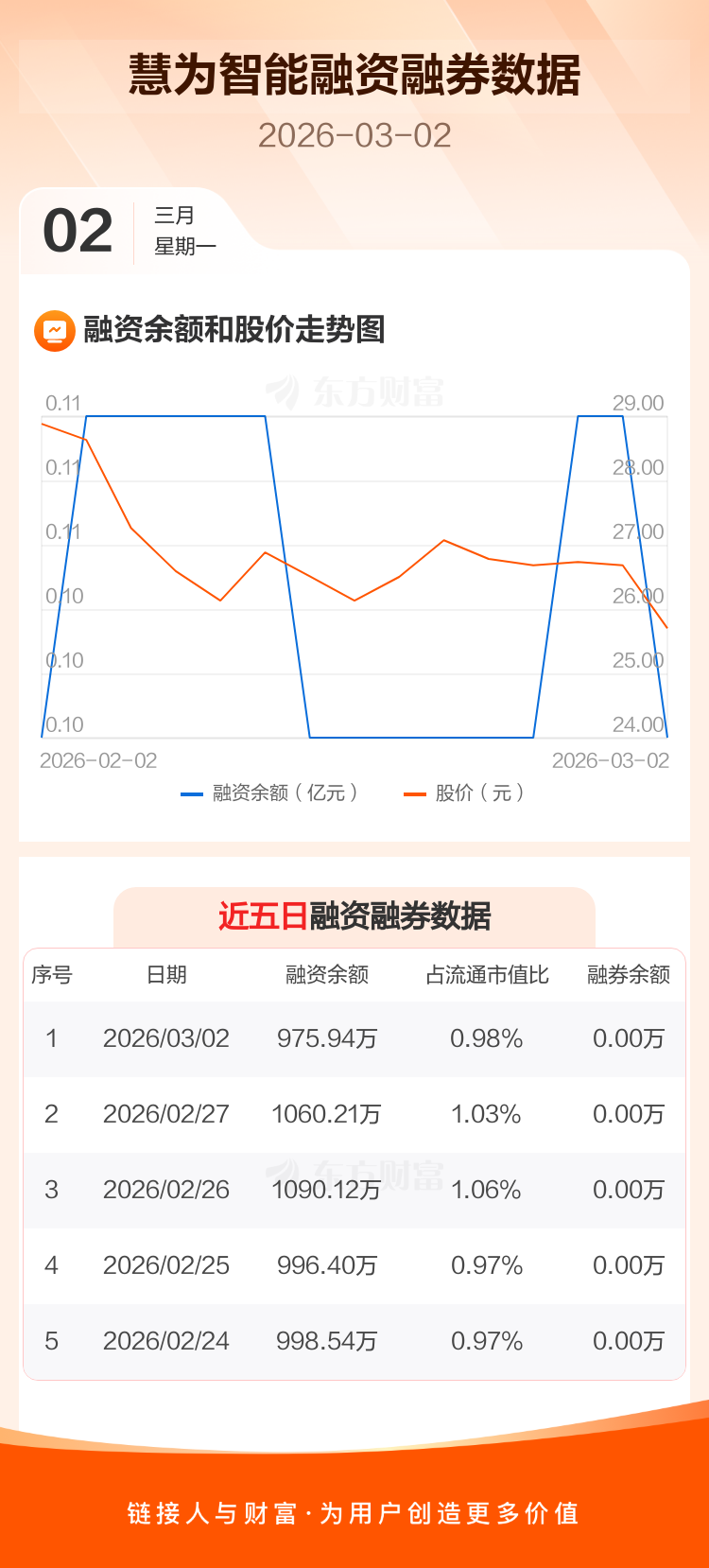 交易所最新数据显示,慧为智能于2026年3月2日获融资买入54.53万元,融资偿还138.80万元,当日融资净偿还84.27万元。目前,该股融资余额975.94万,占流通市值比例为0.98%。