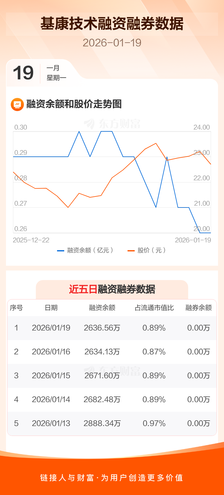 交易所最新数据显示,基康技术于2026年1月19日获融资买入147.07万元,融资偿还144.64万元,当日融资净买入2.44万元。目前,该股融资余额2636.56万,占流通市值比例为0.89%。