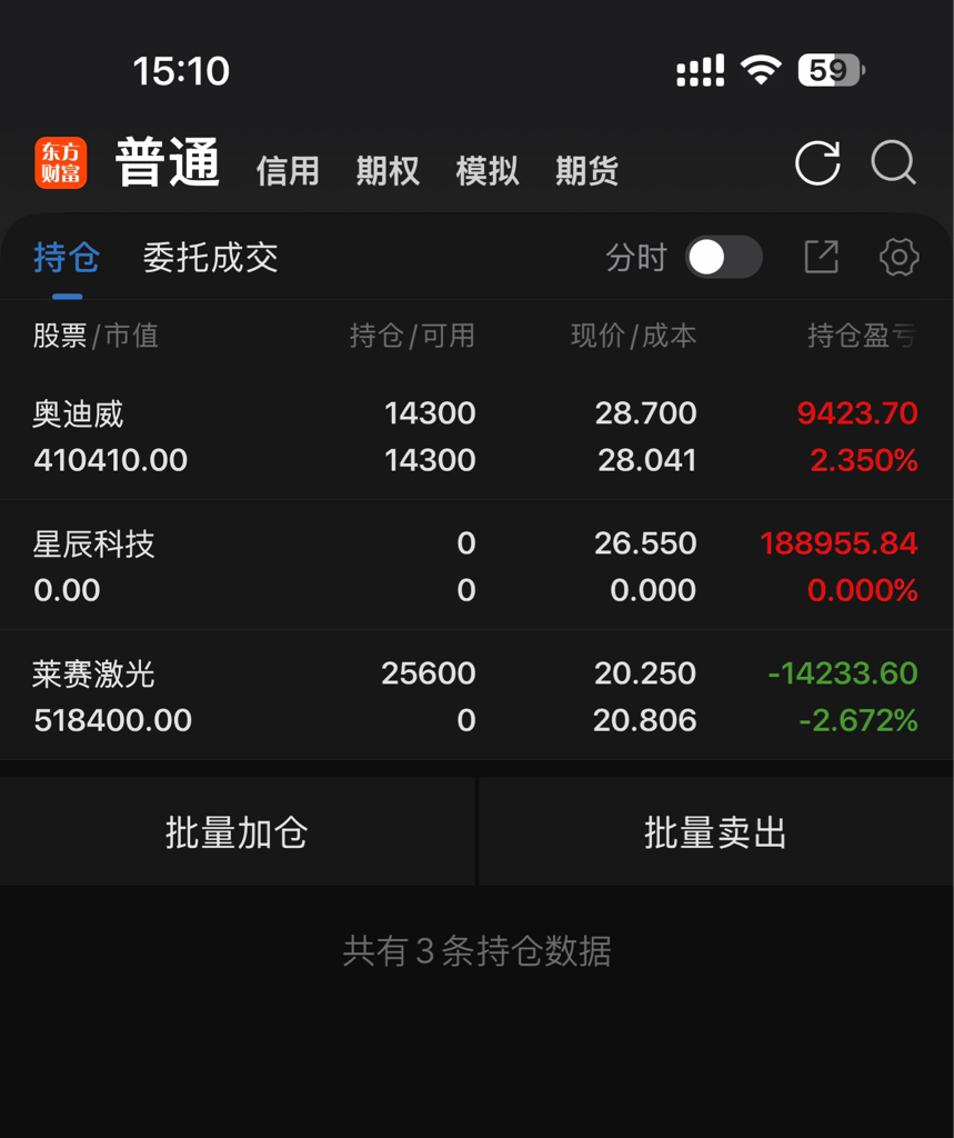 早盘星辰开盘溢价冲高直接不犹豫直接全部出来,在下从来不贪,吃饱了就得擦擦嘴。反手进来了莱赛激光吃了个闭门羹,不过亏损不多,整体趋势仍然看多。奥迪威还是坚定自己的想法,不再多言多语。祝朋友们周末愉快。$星辰科技(SZ920885)$ $莱赛激光(SZ920363)$ $奥迪威(SZ920491)$