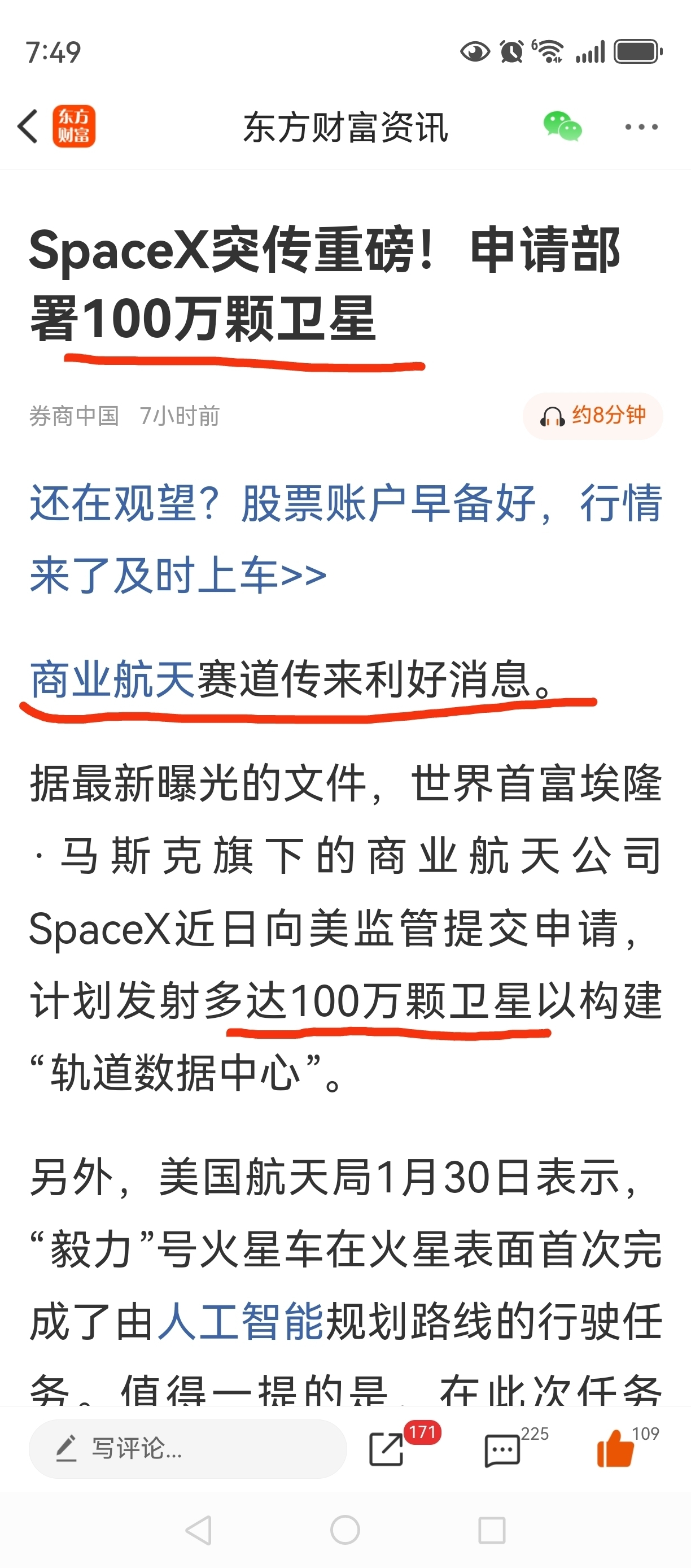 马斯克在社交平台X上转发了关于SpaceX申请发射多达100万颗卫星的报道。