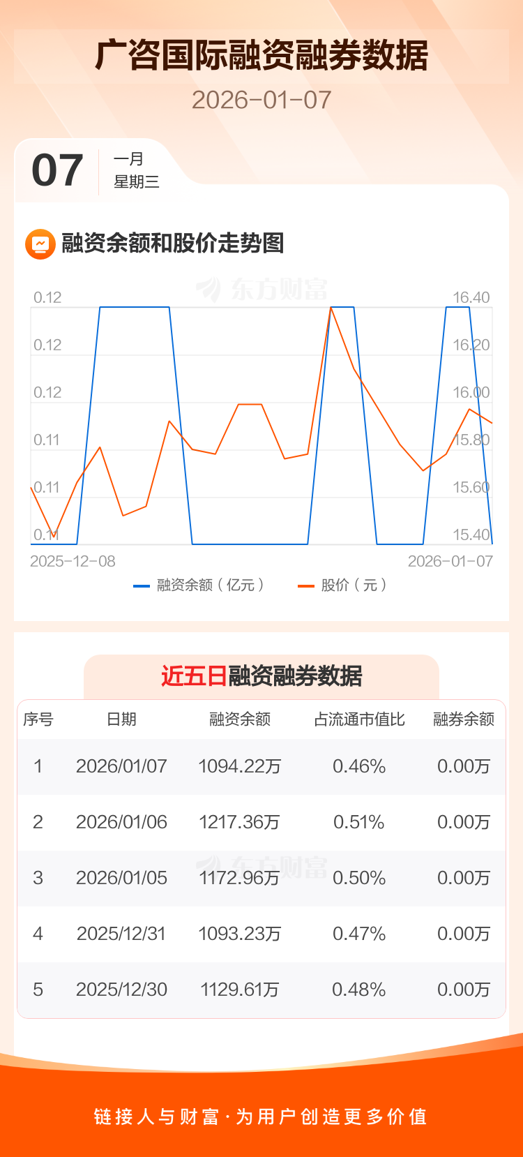 交易所最新数据显示,广咨国际于2026年1月7日获融资买入113.19万元,融资偿还236.32万元,当日融资净偿还123.14万元。目前,该股融资余额1094.22万,占流通市值比例为0.46%。