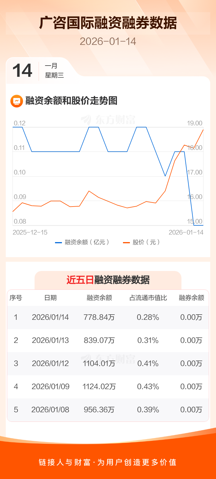 交易所最新数据显示,广咨国际于2026年1月14日获融资买入304.68万元,融资偿还364.91万元,当日融资净偿还60.23万元。目前,该股融资余额778.84万,占流通市值比例为0.28%。
