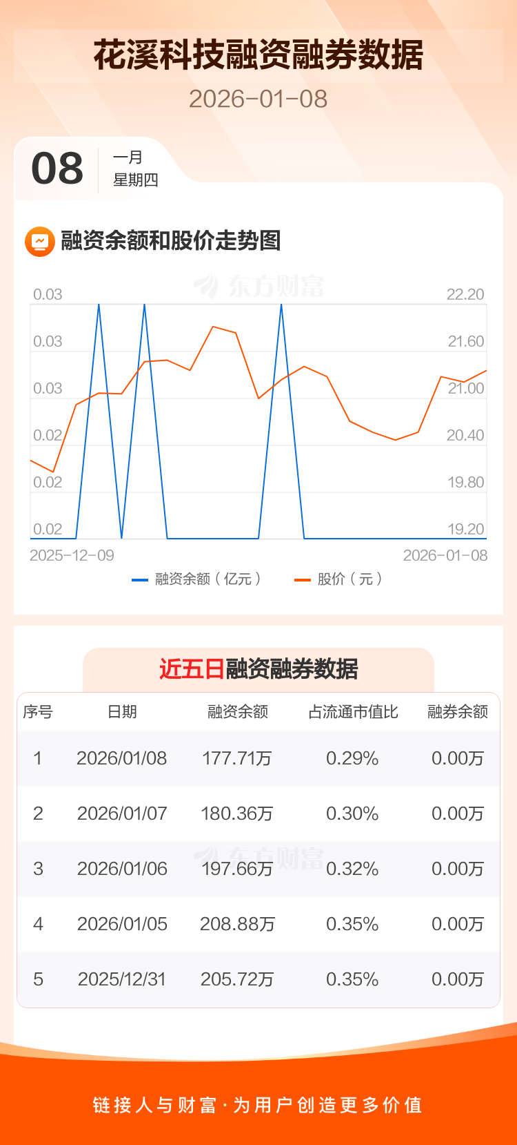 交易所最新数据显示,花溪科技于2026年1月8日获融资买入13.76万元,融资偿还16.40万元,当日融资净偿还2.65万元。目前,该股融资余额177.71万,占流通市值比例为0.29%。