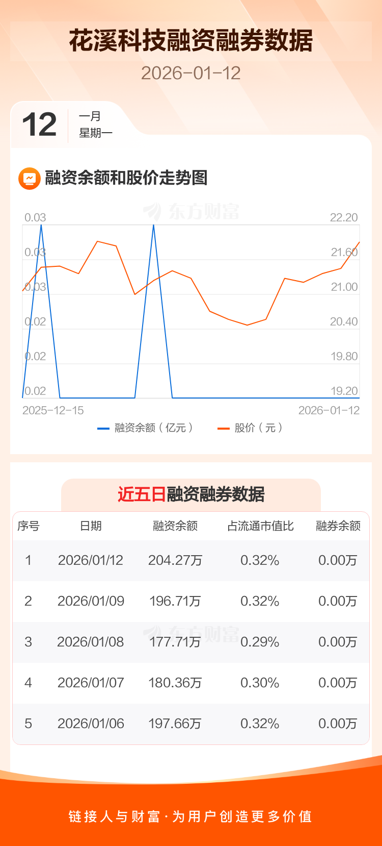 交易所最新数据显示,花溪科技于2026年1月12日获融资买入11.39万元,融资偿还3.83万元,当日融资净买入7.56万元。目前,该股融资余额204.27万,占流通市值比例为0.32%。
