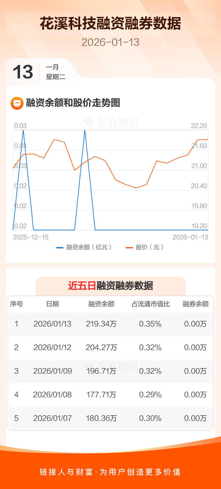 交易所最新数据显示,花溪科技于2026年1月13日获融资买入36.56万元,融资偿还21.49万元,当日融资净买入15.08万元。目前,该股融资余额219.34万,占流通市值比例为0.35%。
