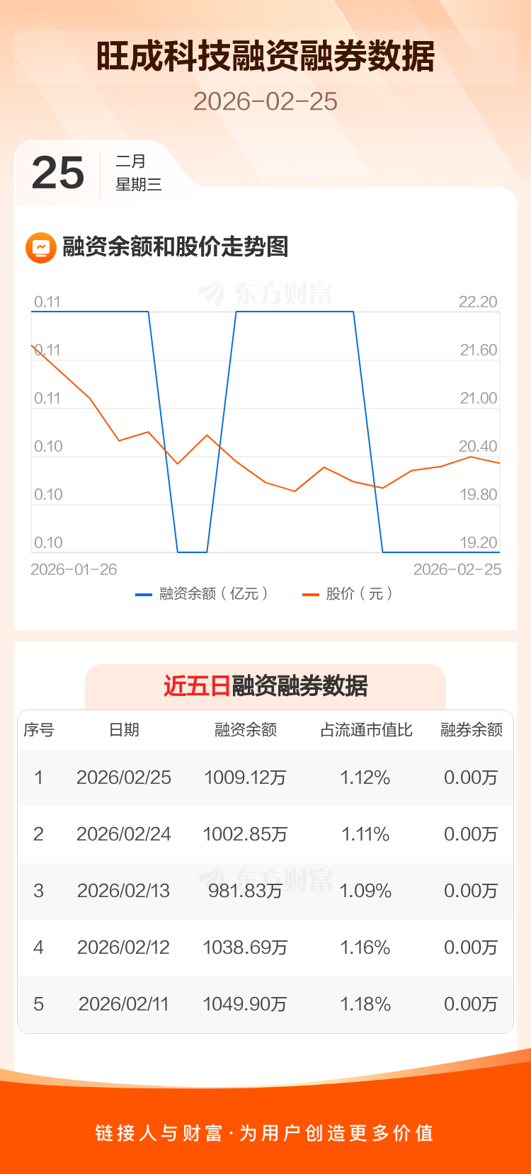交易所最新数据显示,旺成科技于2026年2月25日获融资买入44.65万元,融资偿还38.38万元,当日融资净买入6.27万元。目前,该股融资余额1009.12万,占流通市值比例为1.12%。