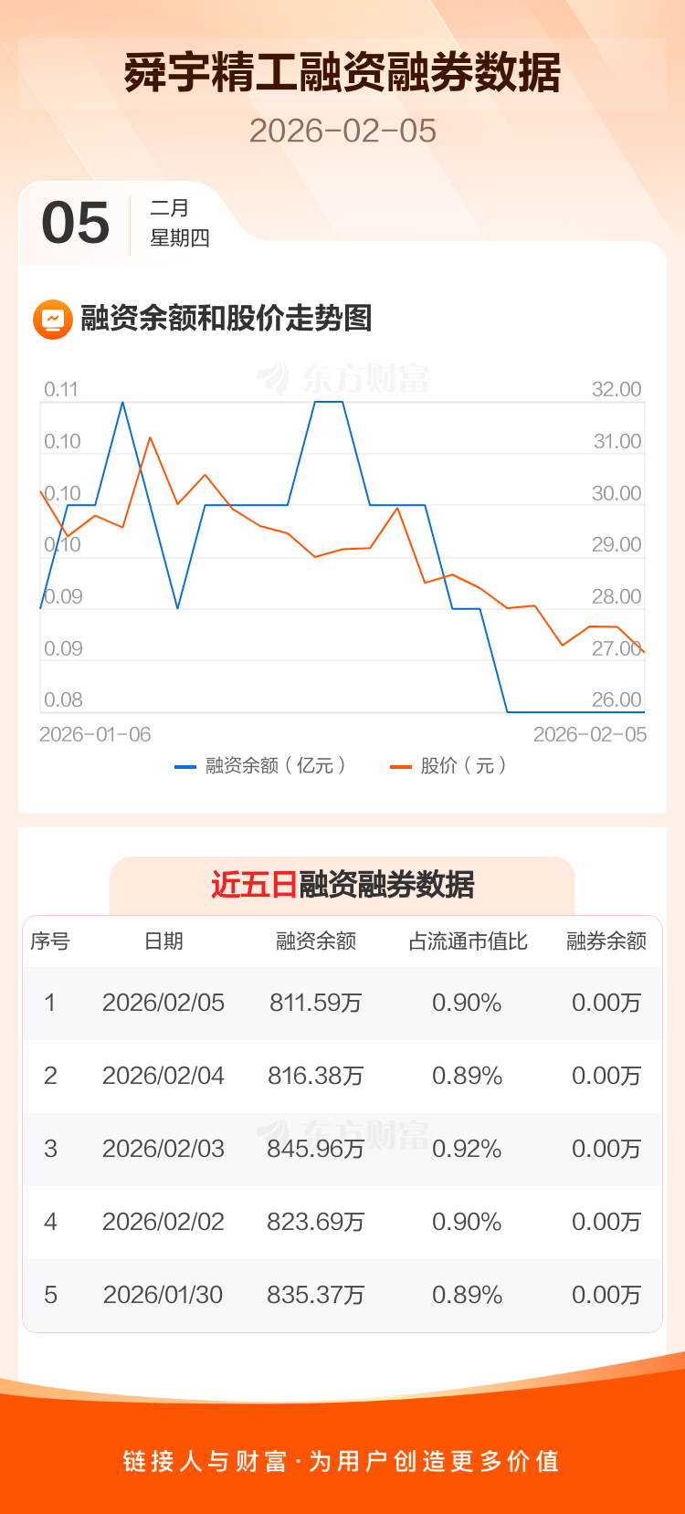 交易所最新数据显示,舜宇精工于2026年2月5日获融资买入3.95万元,融资偿还8.73万元,当日融资净偿还4.78万元。目前,该股融资余额811.59万,占流通市值比例为0.90%。