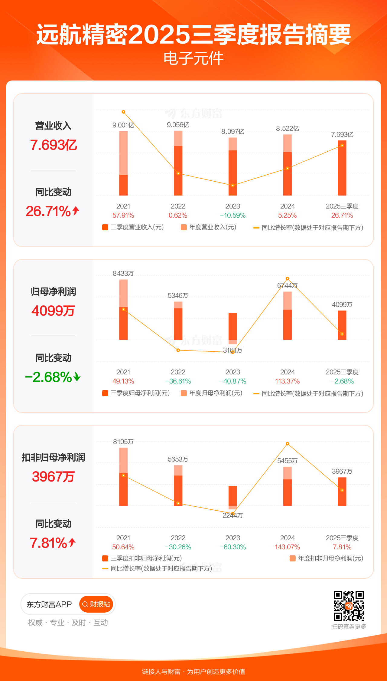 图解财报:远航精密前三季归母净利润4099.49万元,同比减少2.68%