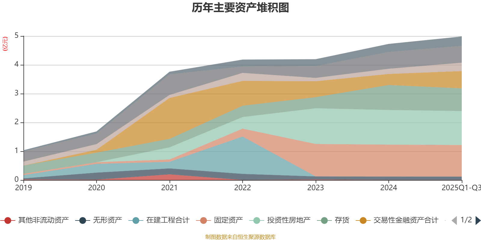 资产重大变化方面,截至2025年三季度末,公司交易性金融资产合计较上年末增加57.47%,占公司总资产比重上升3.98个百分点;存货较上年末减少9.04%,占公司总资产比重下降2.53个百分点;应收票据及应收账款较上年末增加57.83%,占公司总资产比重上升1.93个百分点;投资性房地产较上年末减少2%,占公司总资产比重下降1.81个百分点。