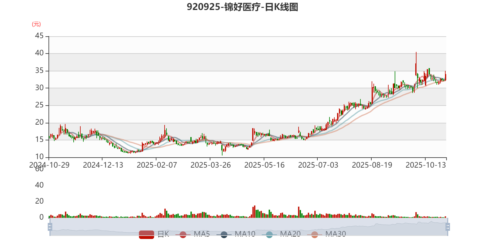 中证智能财讯锦好医疗(920925)10月29日披露2025年第三季度报告。前三季度公司实现营业总收入1.96亿元,同比增长82.44%;归母净利润1763.02万元,同比扭亏;扣非净利润1519.26万元,同比扭亏;经营活动产生的现金流量净额为1540.02万元,上年同期为-2553.45万元;报告期内,锦好医疗基本每股收益为0.18元,加权平均净资产收益率为4.85%。