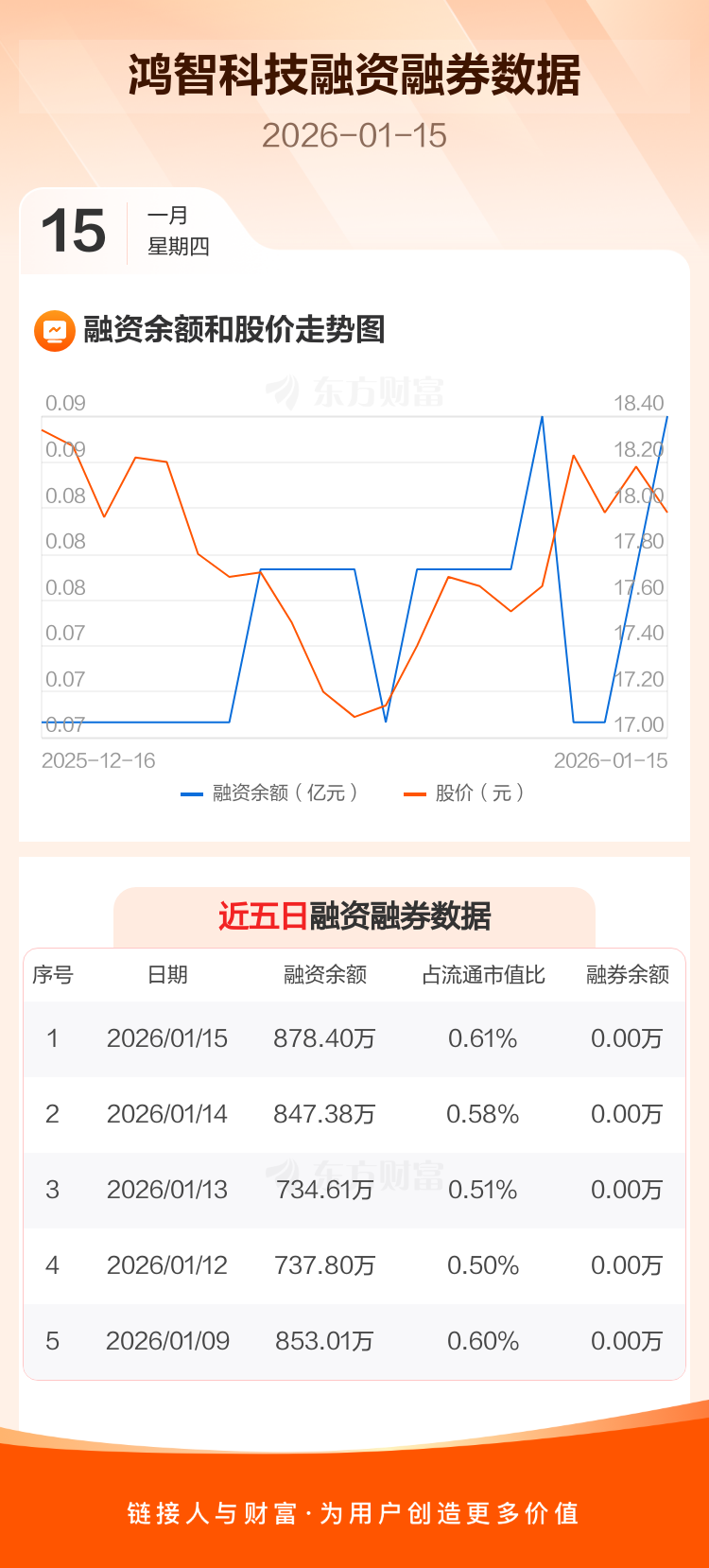 交易所最新数据显示,鸿智科技于2026年1月15日获融资买入129.34万元,融资偿还98.32万元,当日融资净买入31.02万元。目前,该股融资余额878.40万,占流通市值比例为0.61%。