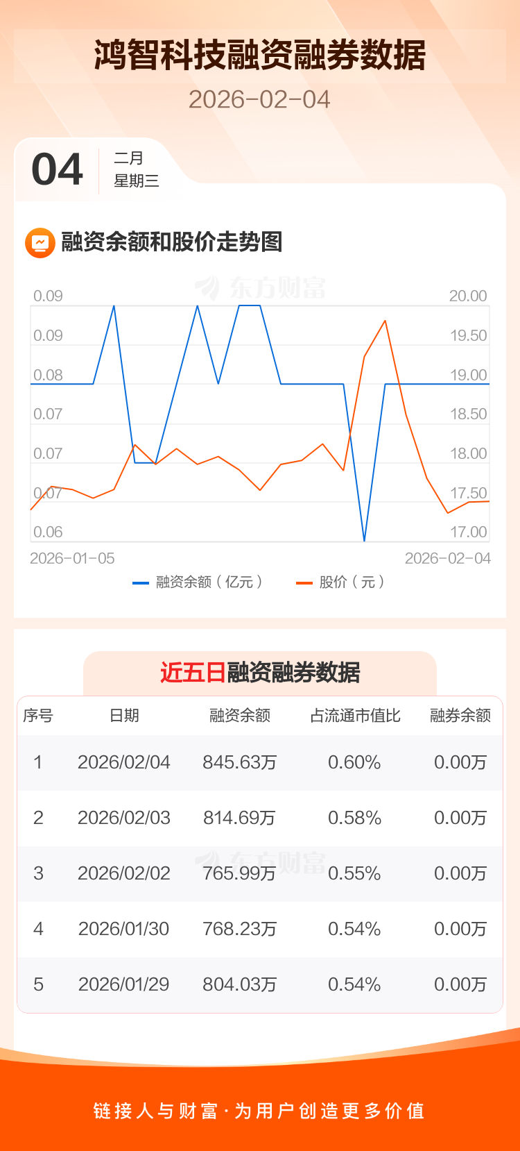 交易所最新数据显示,鸿智科技于2026年2月4日获融资买入126.27万元,融资偿还95.33万元,当日融资净买入30.94万元。目前,该股融资余额845.63万,占流通市值比例为0.60%。