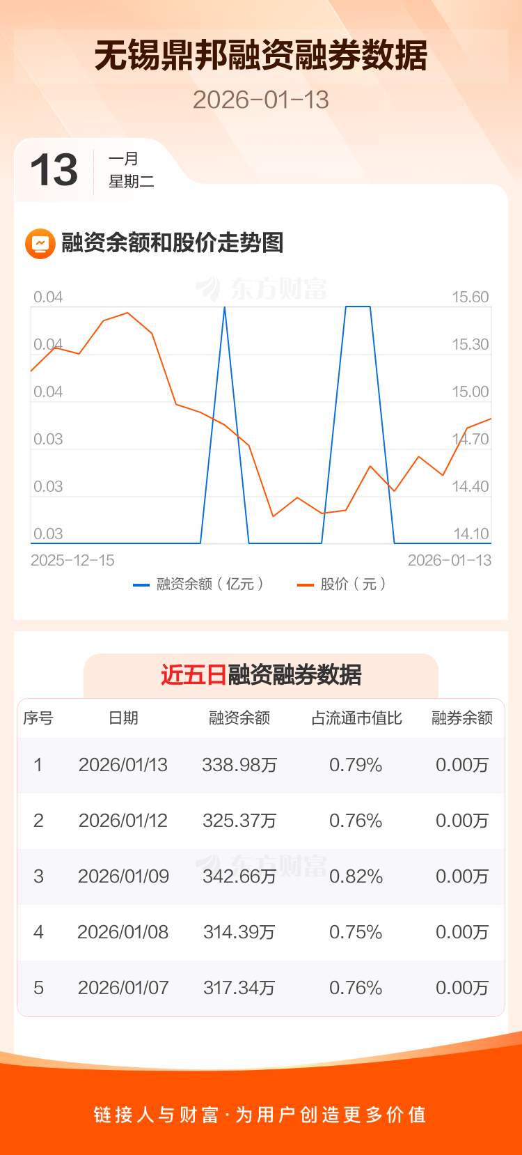 交易所最新数据显示,无锡鼎邦于2026年1月13日获融资买入87.09万元,融资偿还73.48万元,当日融资净买入13.61万元。目前,该股融资余额338.98万,占流通市值比例为0.79%。