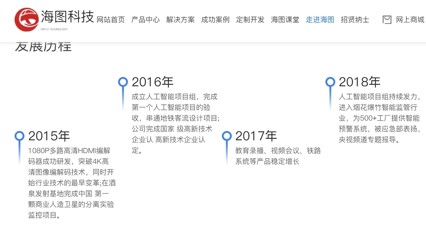 海图科技官网显示,海图科技2015年1080P多路高清HDMI编解码器成功研发,突破4K高清图像编解码技术,同时开始行业技术的最早变革;在酒泉发射基地完成中国第一颗商业人造卫星的分离实验监控项目。