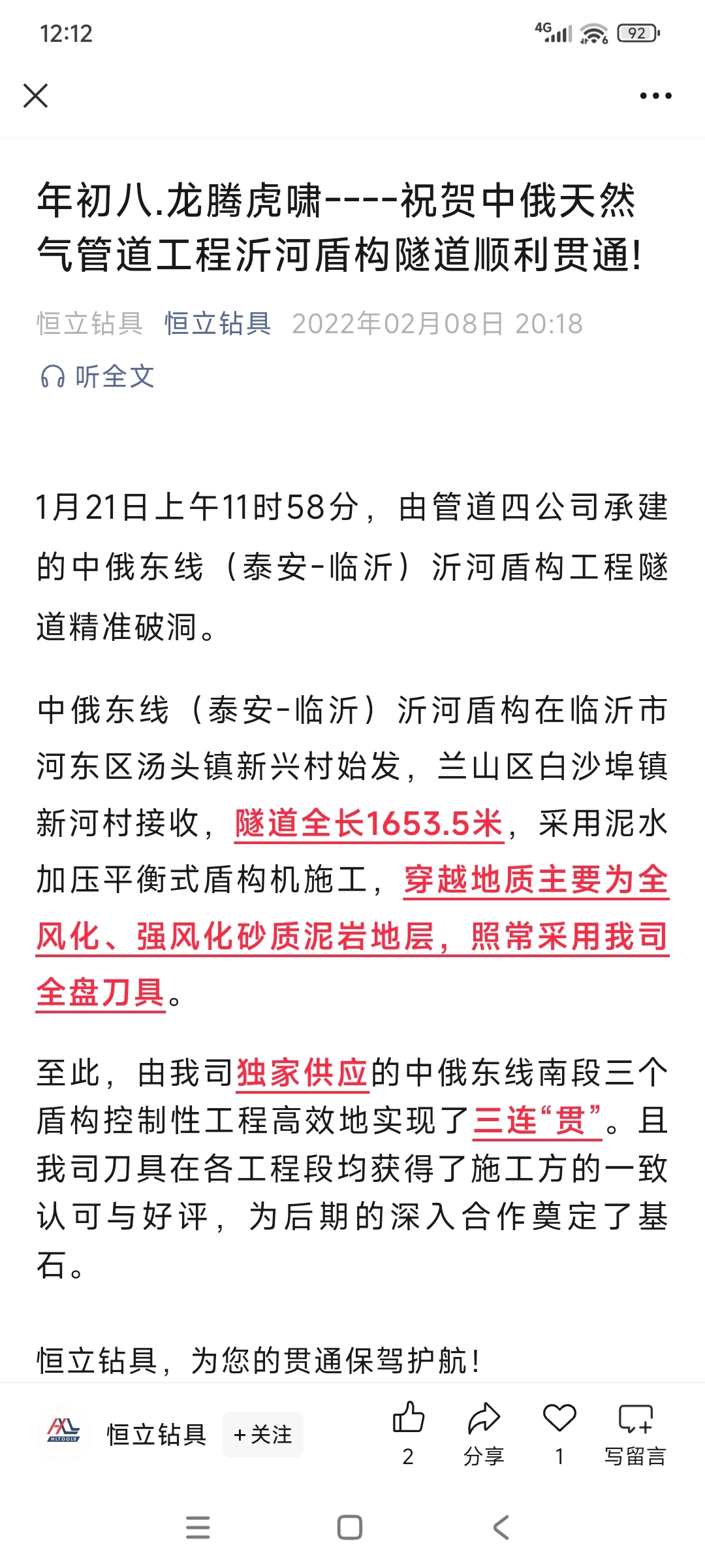 $恒立钻具(SZ920942)$ $石化机械(SZ000852)$ $山河智能(SZ002097)$ 公司独家供应的中俄东线南段三个盾构控制性工程高效地实现了三连“贯”。且我司刀具在各工程段均获得了施工方的一致认可与好评,为后期的深入合作奠定了基石。