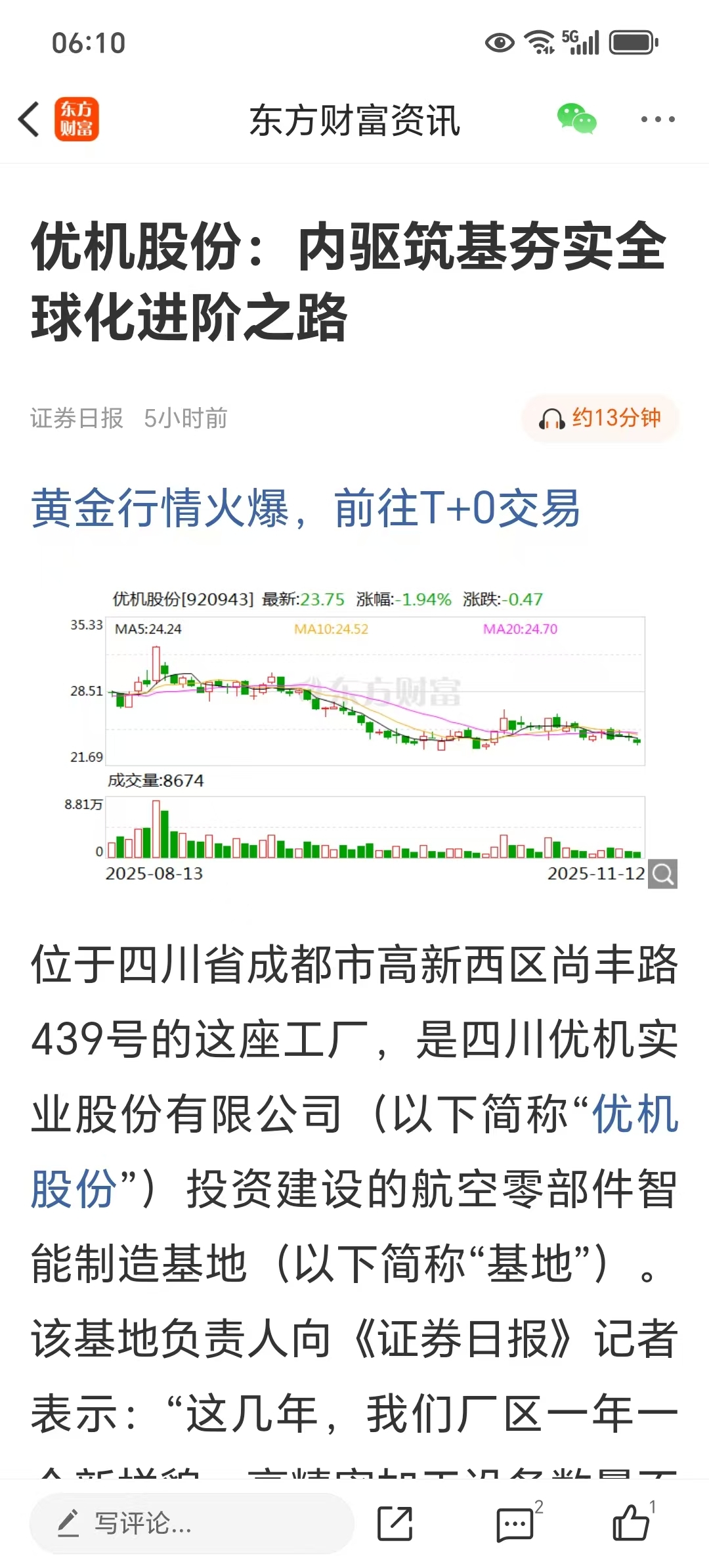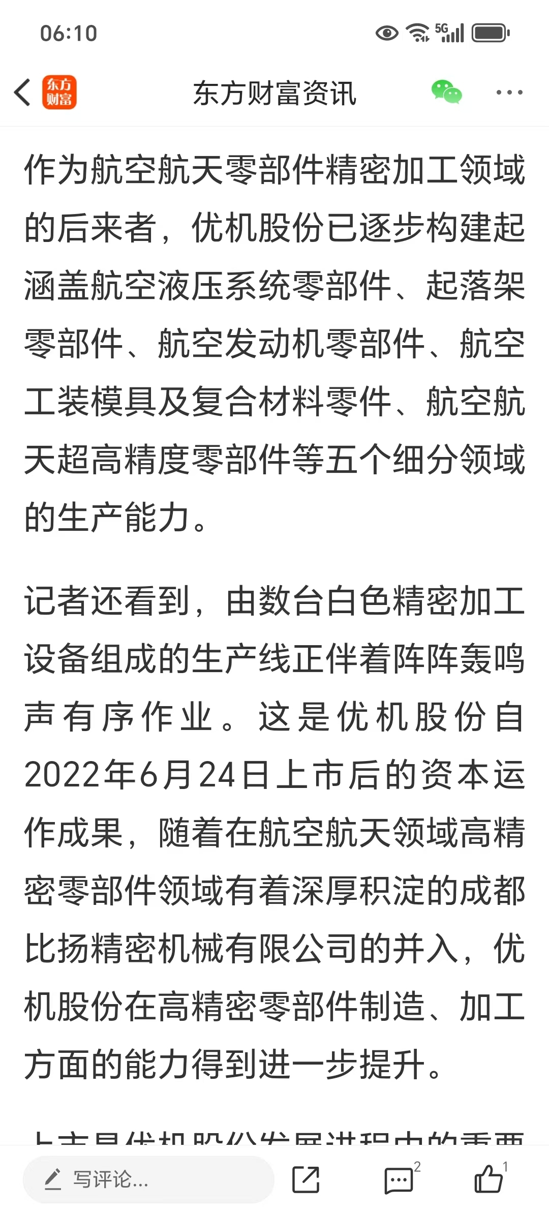 $优机股份(SZ920943)$ $星图测控(SZ920116)$ $创远信科(SZ920961)$ 作为航空航天零部件精密加工领域的后来者: 优机股份,已逐步构建起涵盖航空液压系统零部件、起落架零部件、航空发动机零部件、航空工装模具及复合材料零件、航空航天超高精度零部件等五个细分领域的生产能力。