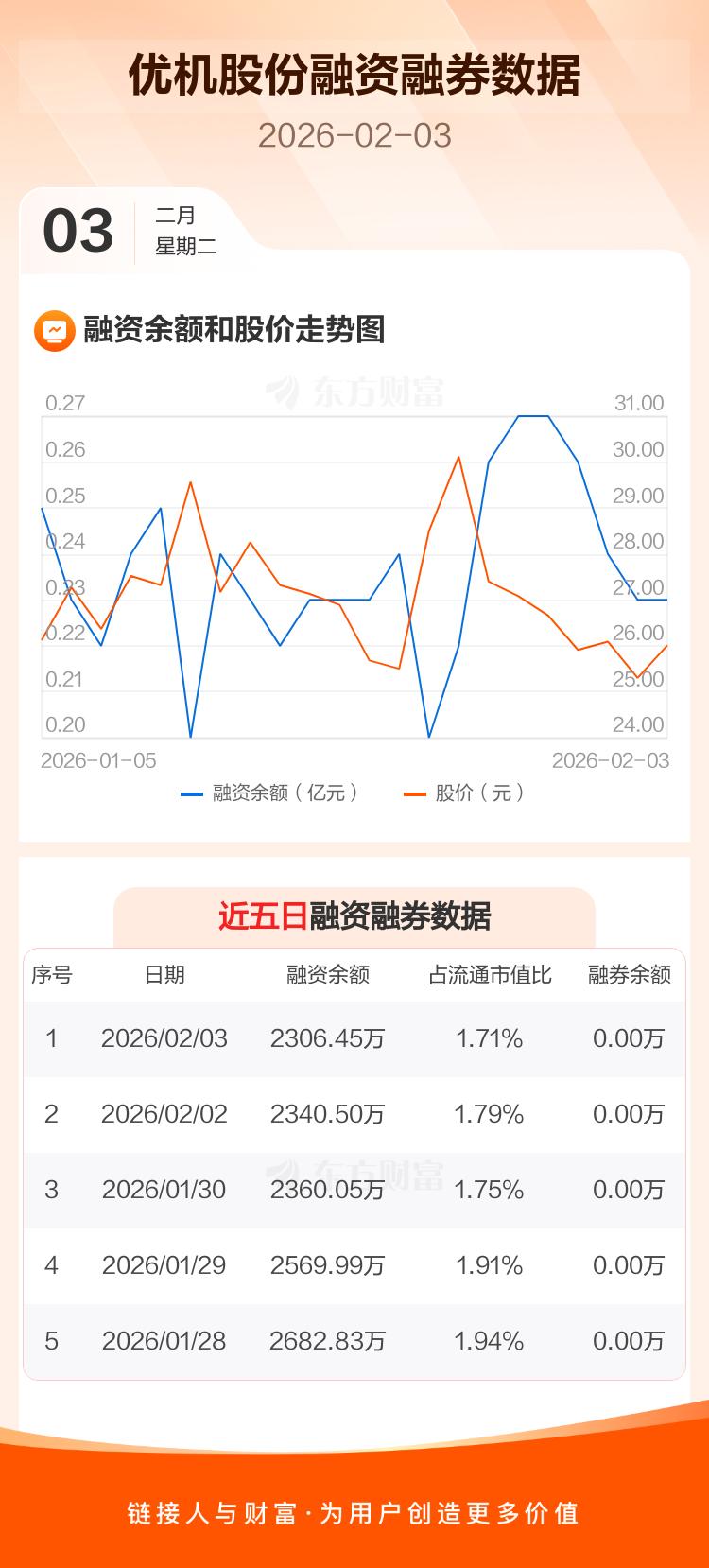 交易所最新数据显示,优机股份于2026年2月3日获融资买入146.61万元,融资偿还180.66万元,当日融资净偿还34.05万元。目前,该股融资余额2306.45万,占流通市值比例为1.71%。