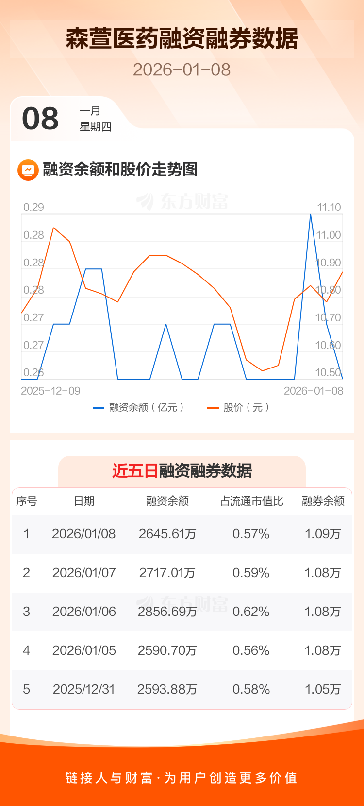 交易所最新数据显示,森萱医药于2026年1月8日获融资买入218.10万元,融资偿还289.50万元,当日融资净偿还71.4万元。目前,该股融资余额2645.61万,占流通市值比例为0.57%。