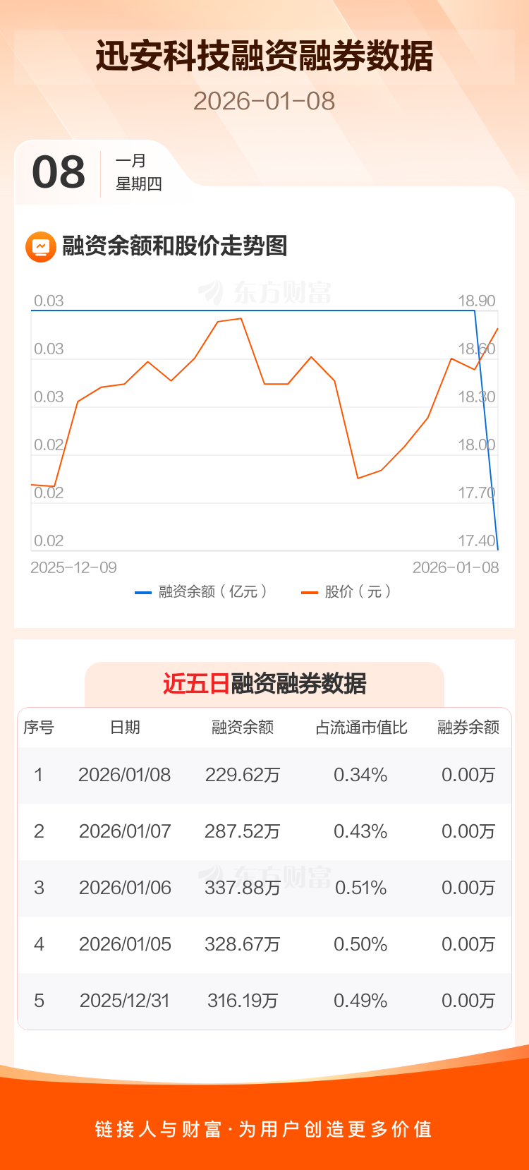 交易所最新数据显示,迅安科技于2026年1月8日获融资买入17.04万元,融资偿还74.94万元,当日融资净偿还57.9万元。目前,该股融资余额229.62万,占流通市值比例为0.34%。