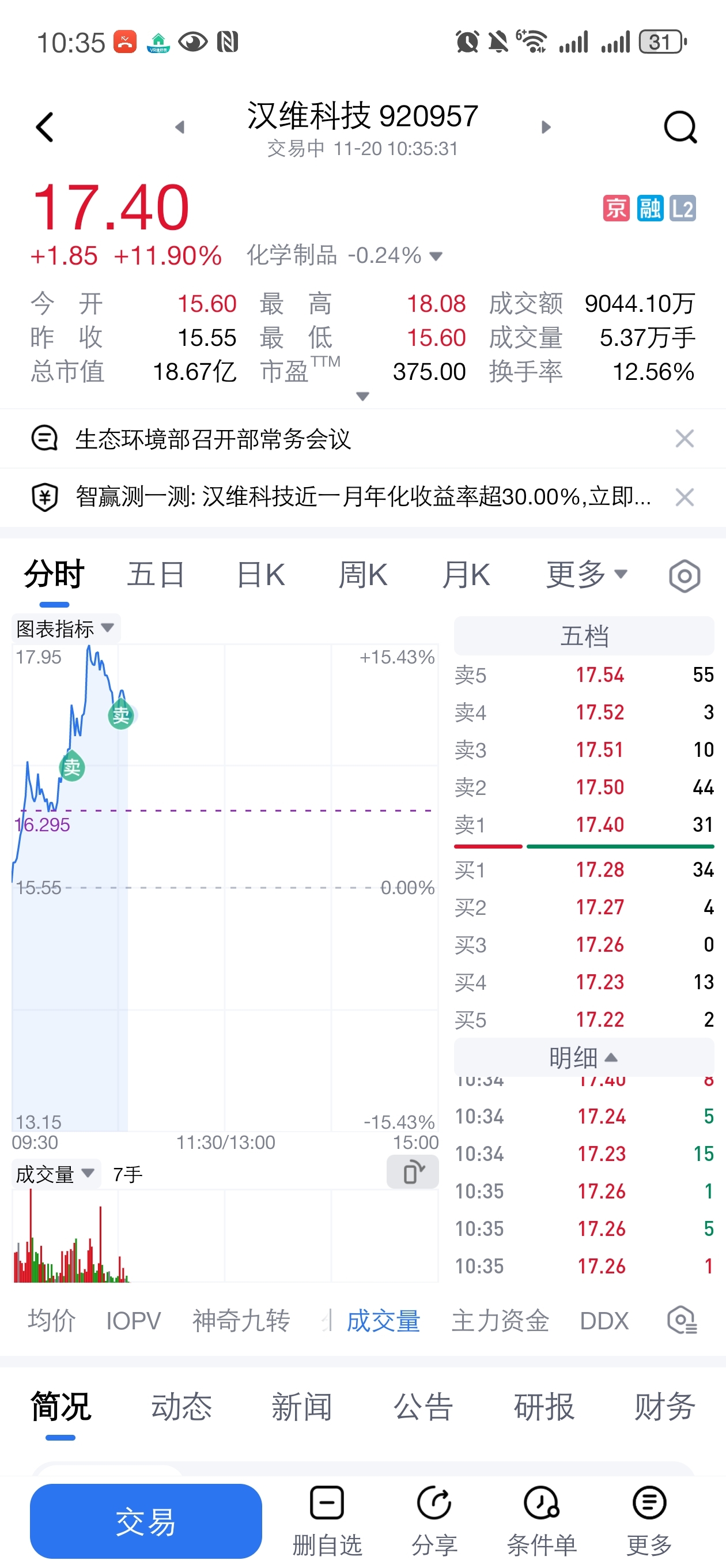 $汉维科技(SZ920957)$ 16块99走了一部分,后面挂涨停价没卖掉,我看他嗯,下在在跌,我17块2卖掉了,先落袋为安吧