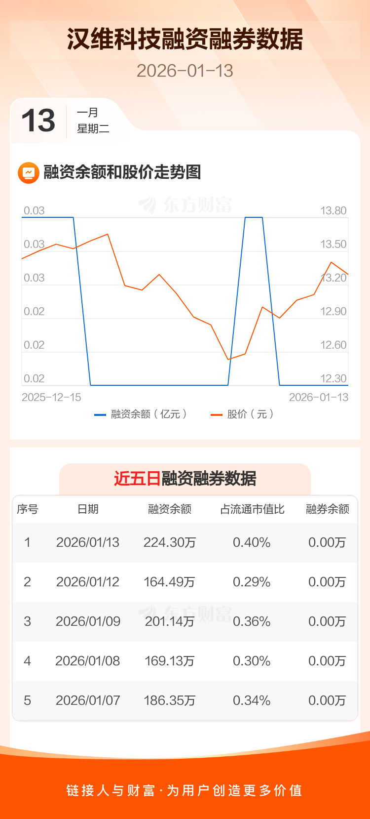 交易所最新数据显示,汉维科技于2026年1月13日获融资买入106.48万元,融资偿还46.66万元,当日融资净买入59.81万元。目前,该股融资余额224.30万,占流通市值比例为0.40%。