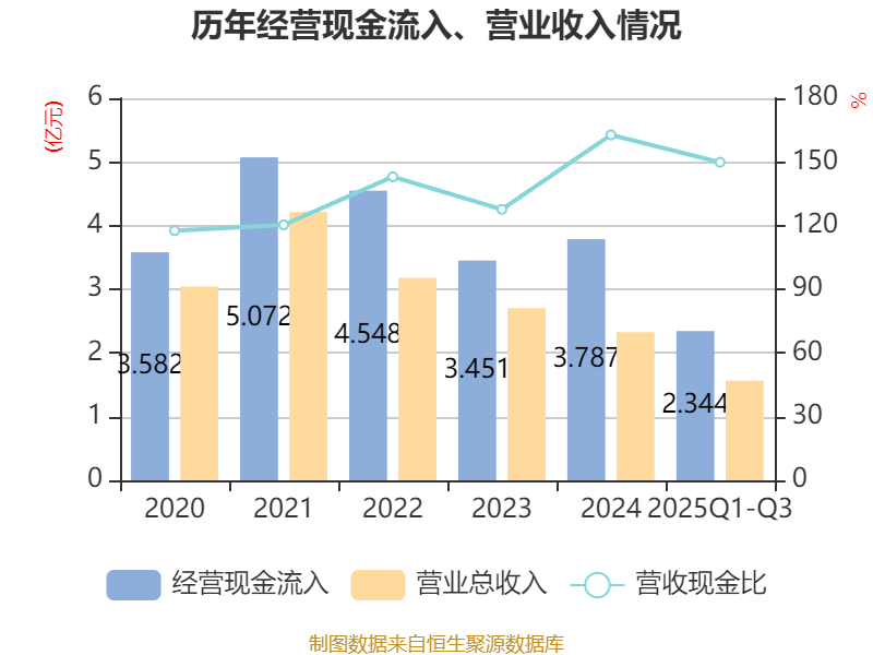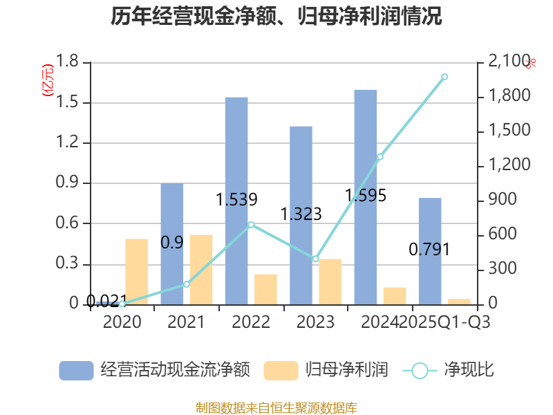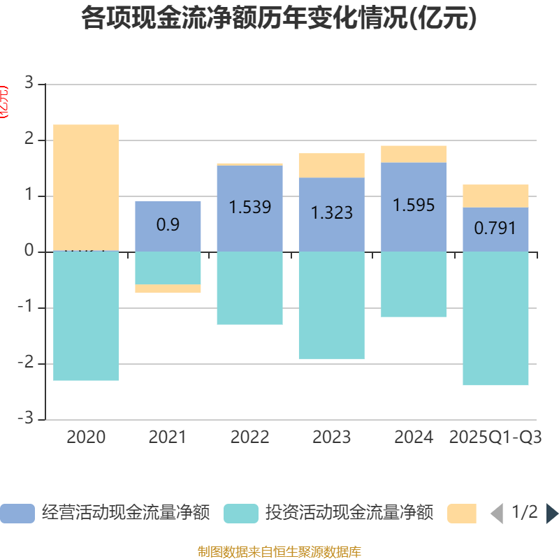 2025年前三季度,公司经营活动现金流净额为7909.4万元,同比增长244.61%;筹资活动现金流净额4080.8万元,同比减少171.96万元;投资活动现金流净额-2.39亿元,上年同期为-8931.52万元。