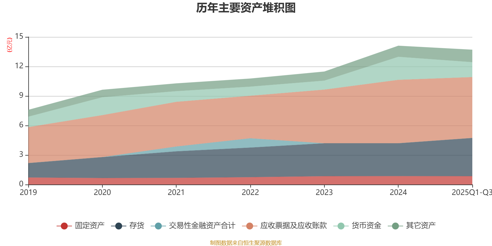 资产重大变化方面,截至2025年三季度末,公司货币资金较上年末减少35.32%,占公司总资产比重下降5.56个百分点;存货较上年末增加16.42%,占公司总资产比重上升4.69个百分点;其他流动资产较上年末增加119.79%,占公司总资产比重上升0.58个百分点;应收票据及应收账款较上年末减少4.04%,占公司总资产比重下降0.56个百分点。