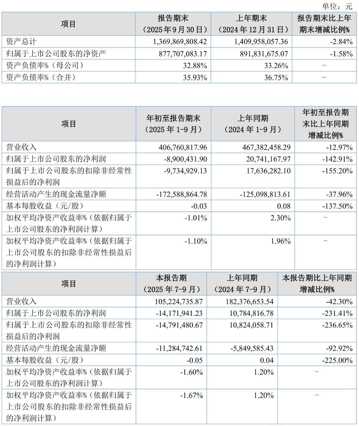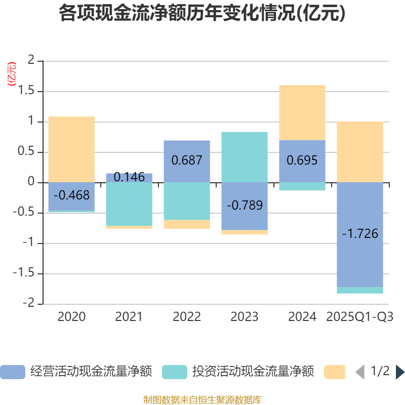 2025年前三季度,公司经营活动现金流净额为-1.73亿元,同比减少4749.01万元;筹资活动现金流净额9999.04万元,同比增加326.84万元;投资活动现金流净额-1058.54万元,上年同期为-1098.64万元。