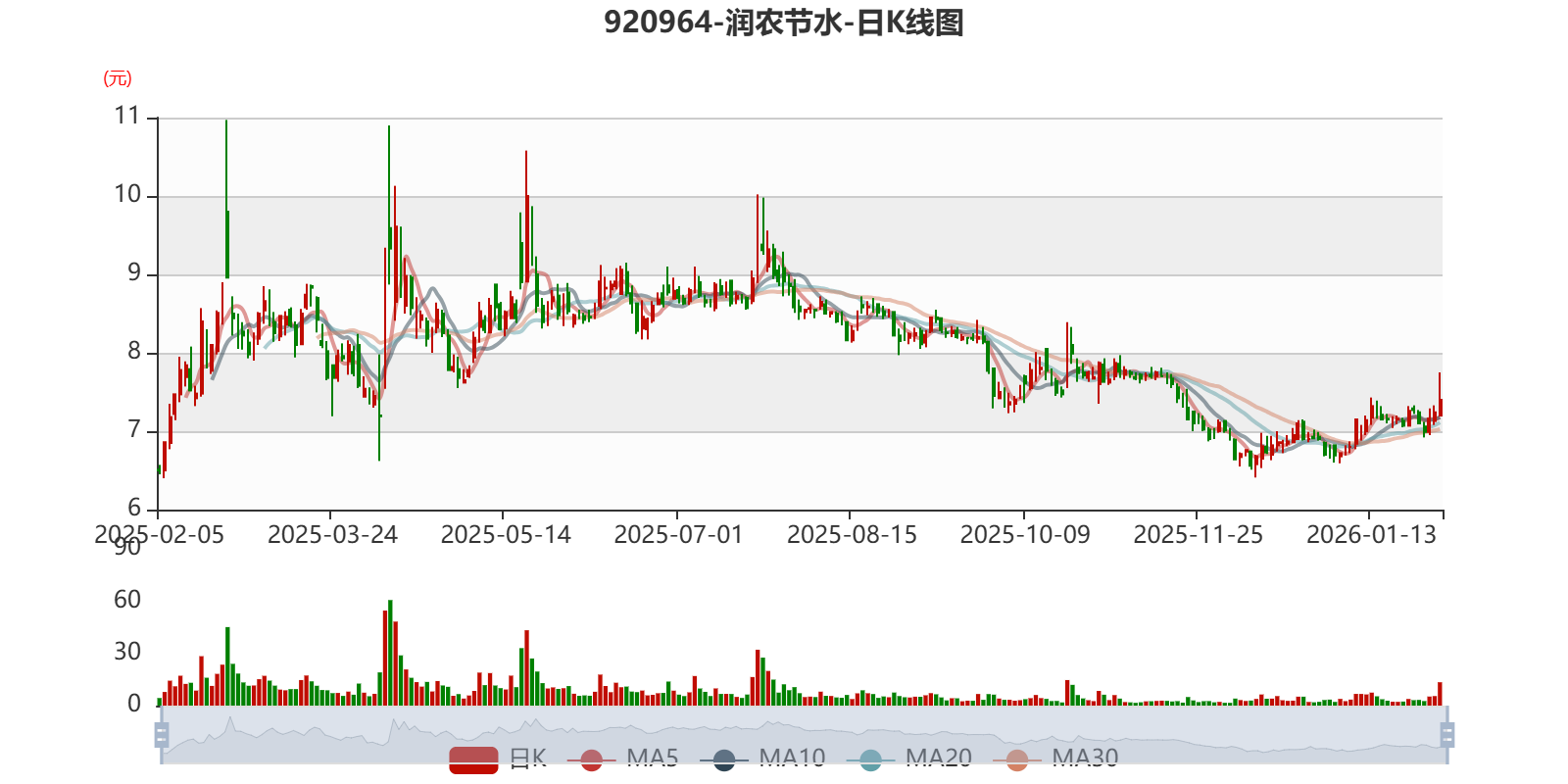 中证智能财讯润农节水(920964)1月30日晚间披露2025年度业绩预告,预计2025年归母净利润300万元至450万元,同比下降43.39%-62.26%。以1月30日收盘价计算,润农节水目前市盈率(TTM)约为429.54倍-644.31倍,市净率(LF)约2.2倍,市销率(TTM)约2.09倍。
