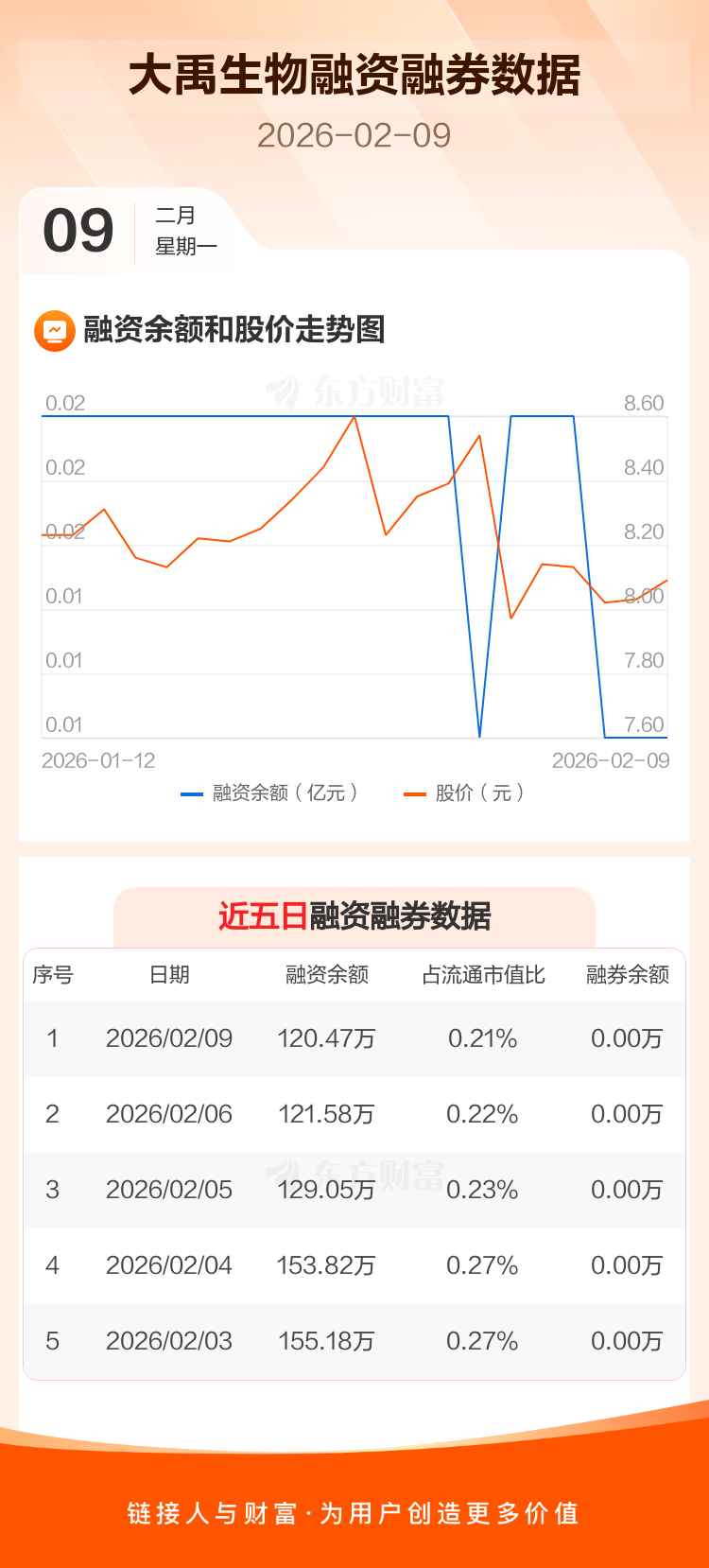 交易所最新数据显示,大禹生物于2026年2月9日获融资买入0元,融资偿还1.11万元,当日融资净偿还1.11万元。目前,该股融资余额120.47万,占流通市值比例为0.21%。