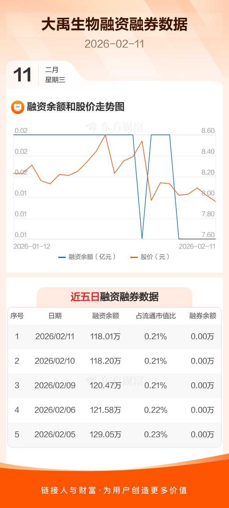 交易所最新数据显示,大禹生物于2026年2月11日获融资买入0元,融资偿还1907元,当日融资净偿还1907元。目前,该股融资余额118.01万,占流通市值比例为0.21%。