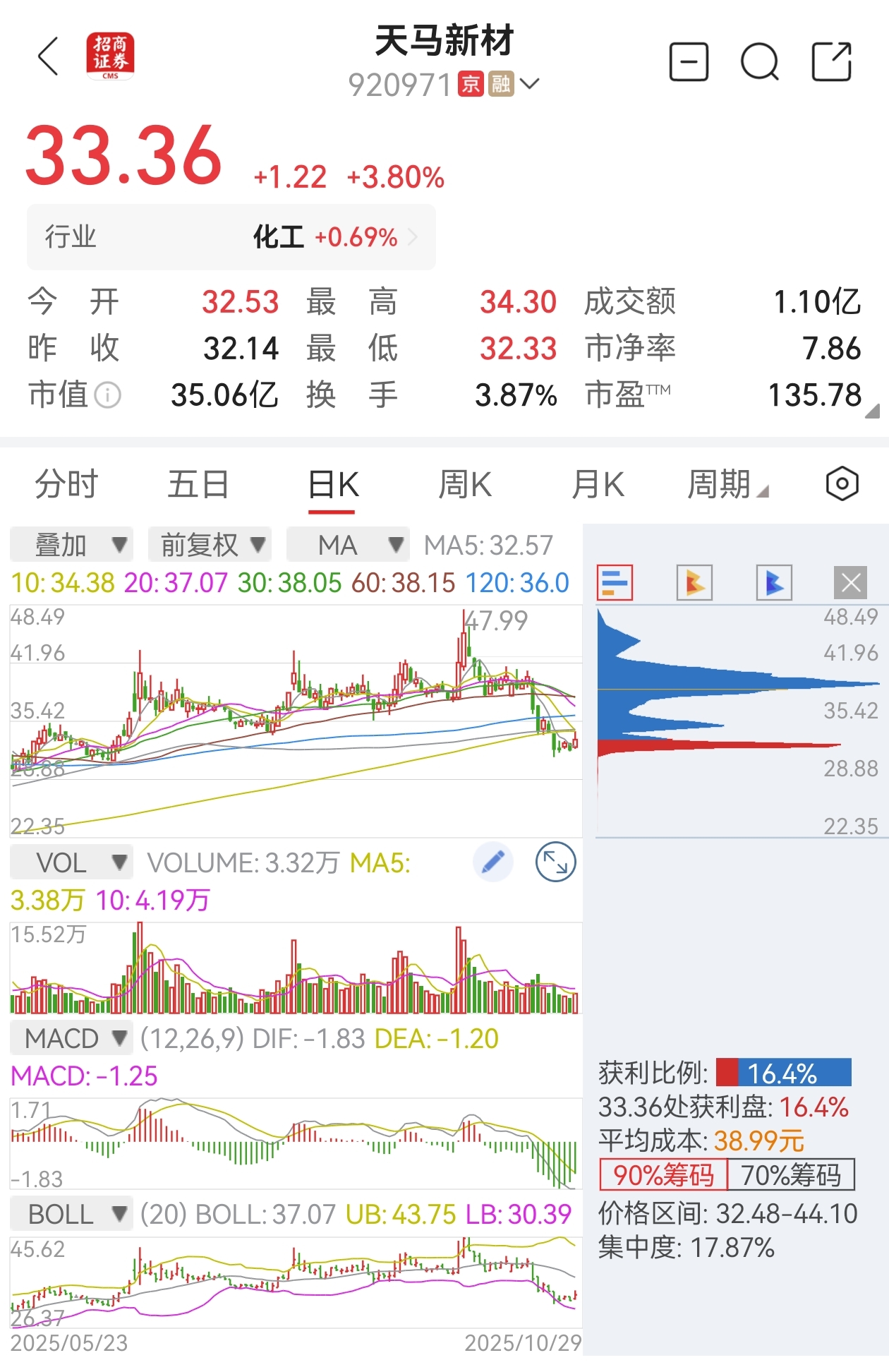 今天到明天晚上其他几匹马公布业绩,今天福马涨停打开,估计就是这隐忧。对天马而言,先前有人估计看了一二季度业绩后觉得会恶化提前跑路,现在看已经上岸,不管是利好利空都已明牌,那这会根本找不到下跌的理由了,目前位置,看修复,大半年的时间都在32-43的箱体内,目前向上的空间已经留出来,你可是30cm的!
