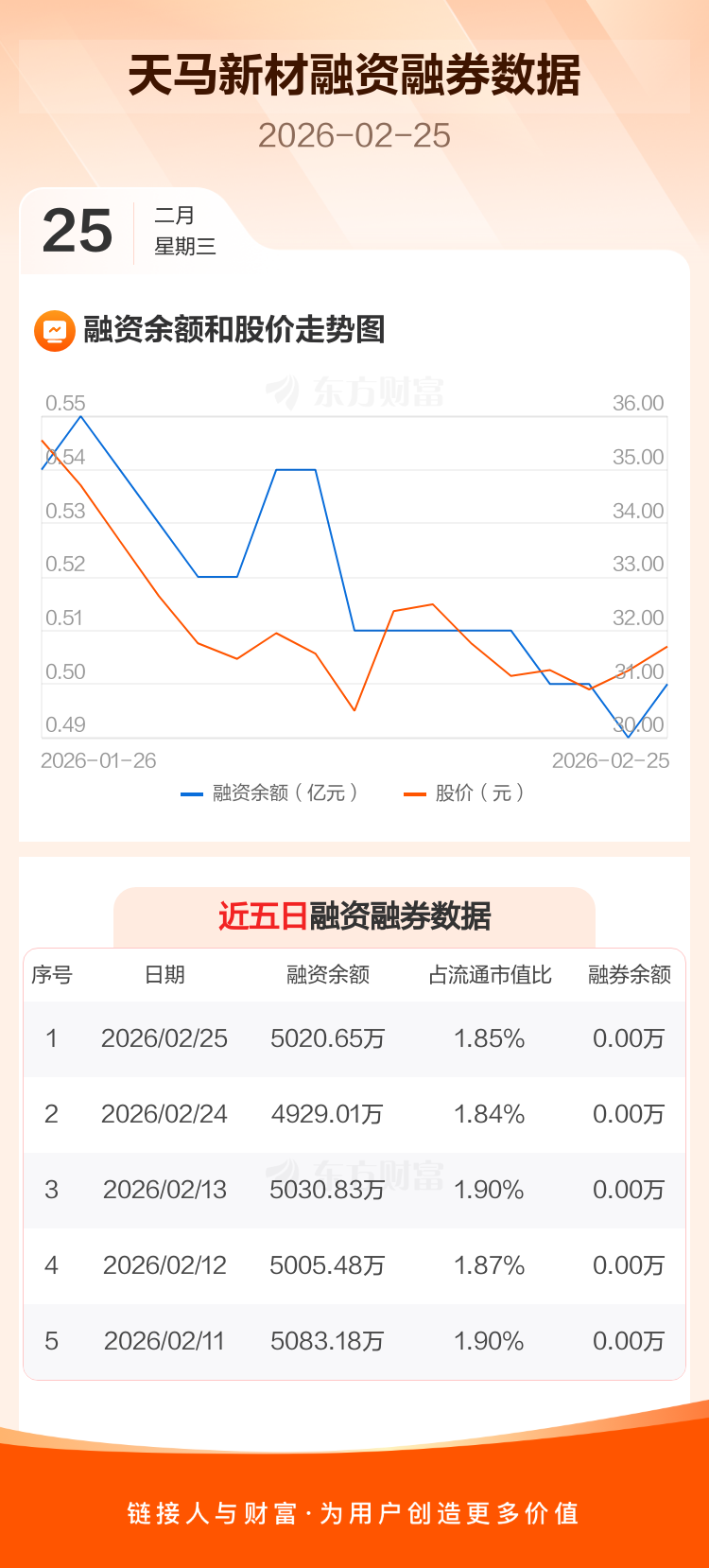 交易所最新数据显示,天马新材于2026年2月25日获融资买入277.79万元,融资偿还186.16万元,当日融资净买入91.64万元。目前,该股融资余额5020.65万,占流通市值比例为1.85%。