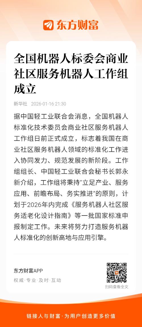 记者1月16日从中国轻工业联合会获悉,全国机器人标准化技术委员会商业社区服务机器人工作组日前正式成立,标志着我国在商业社区服务机器人领域的标准化工作进入协同发力、规范发展的新阶段。